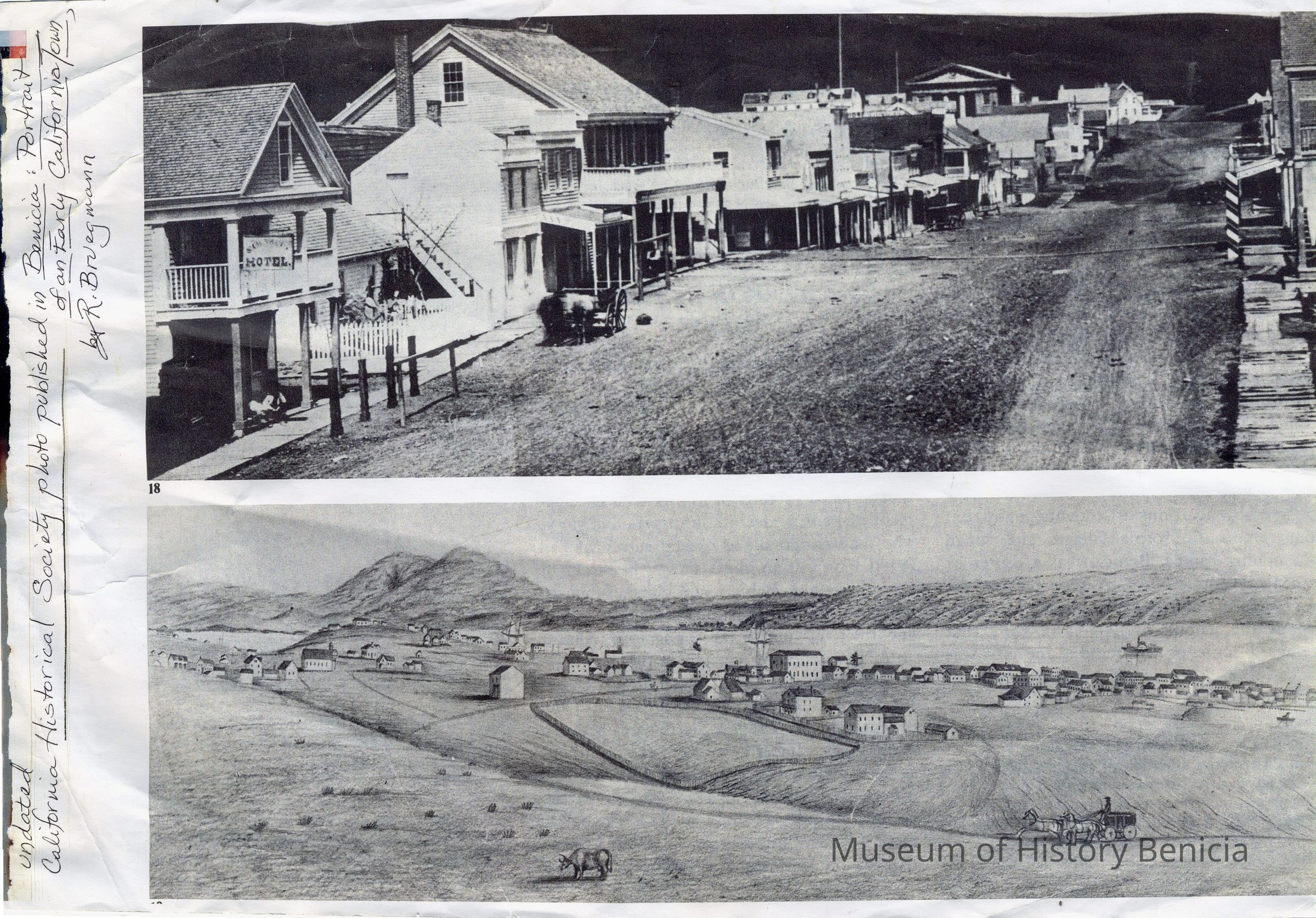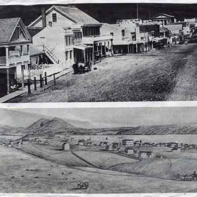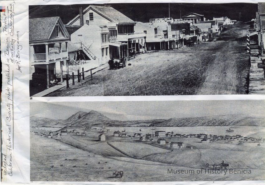 Two copies of photographs used in the book "Benicia, Portrait of an Early California Town", by R. Bruegmann. The top photo shows First street in the late 1800s. The bottom photo shows a copy of a lithograph of Benicia shortly after it was established.Collection