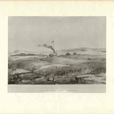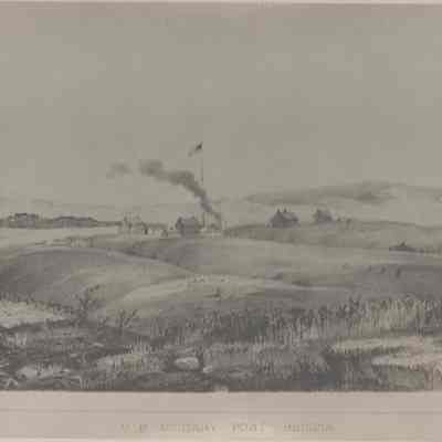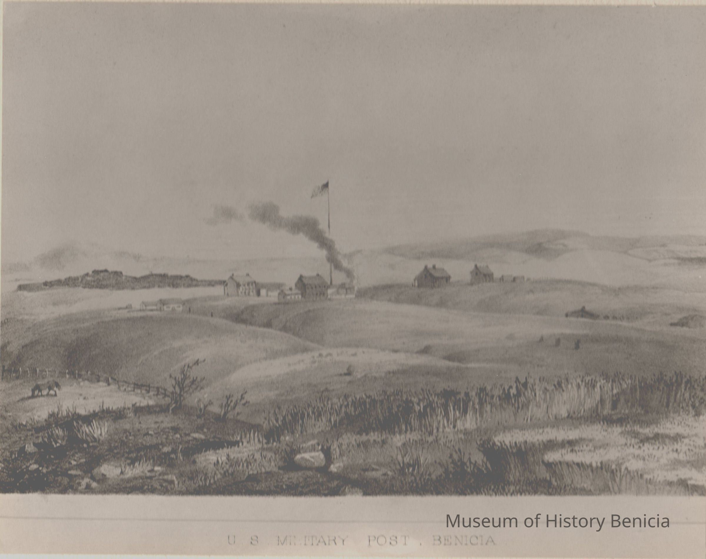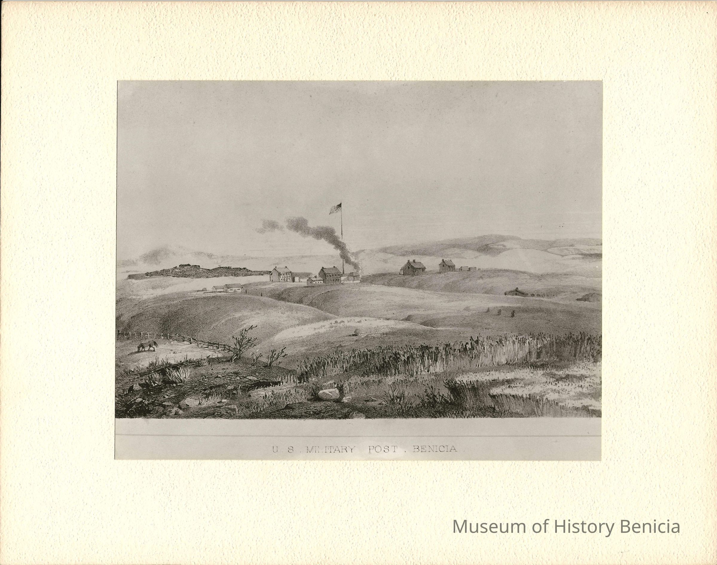 Black and white photograph on white matting board. Titled "U.S. Military Post, Benicia". View of the Benicia hills and military buildings, US flag, fireplace smoke, and horse in a corral.Collection