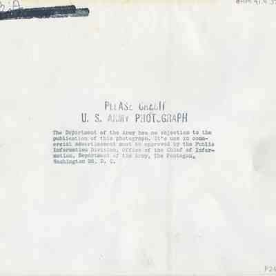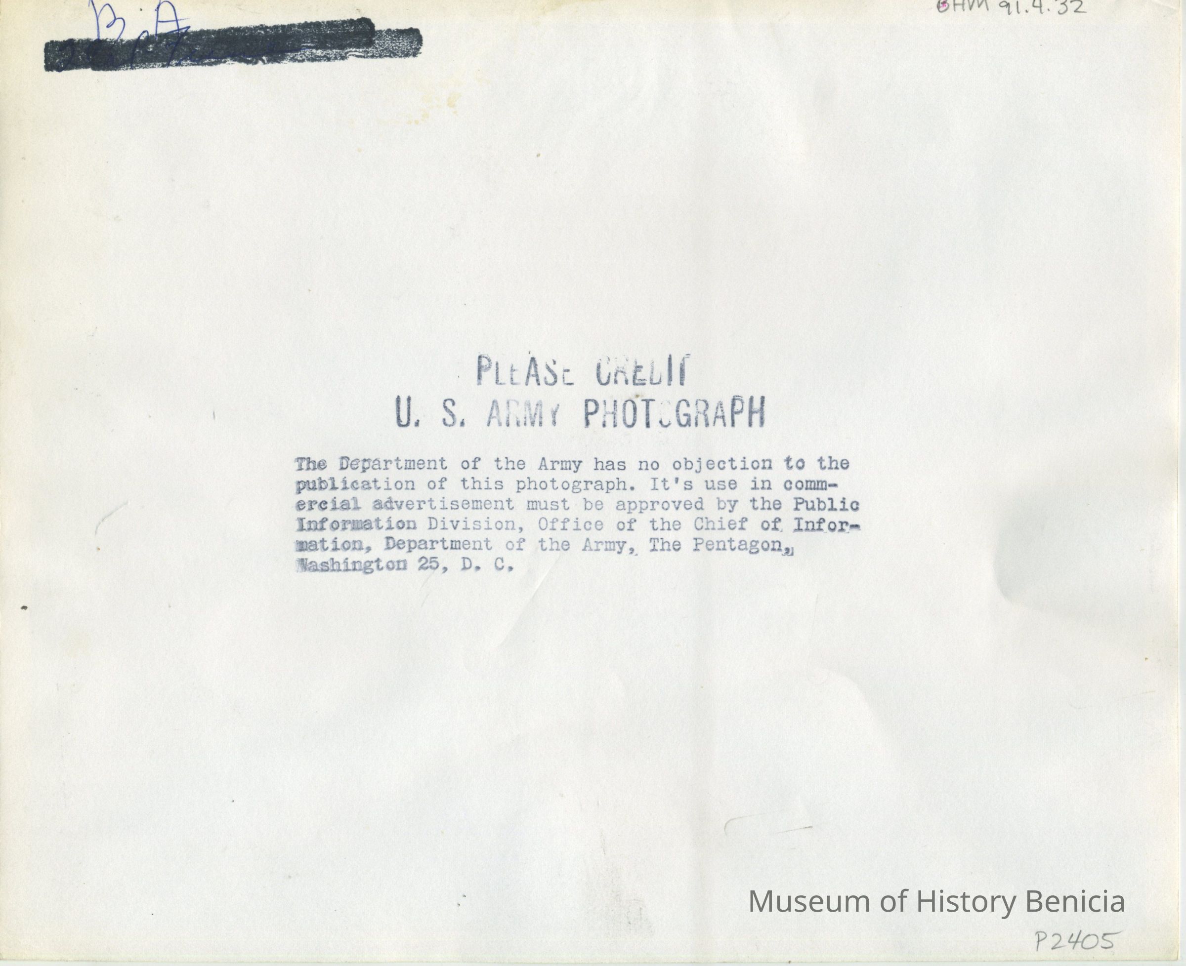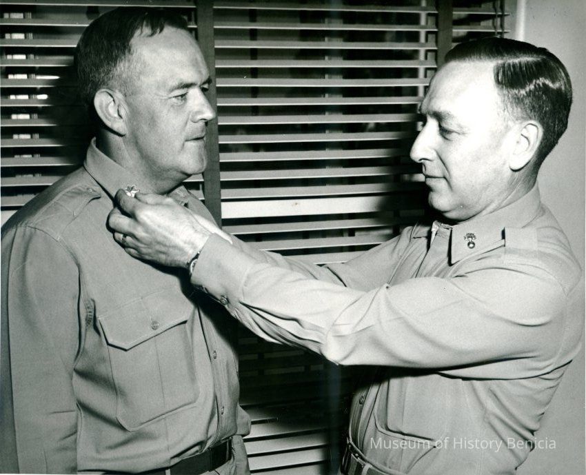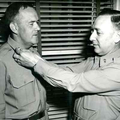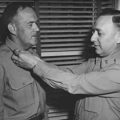 B/W photograph: On the left is Harold Alvin Miller. On the right is Col. D. W. Allison pinning Major leaves on Mr. Miller in a promotion ceremony.Collection