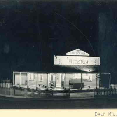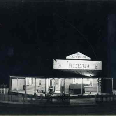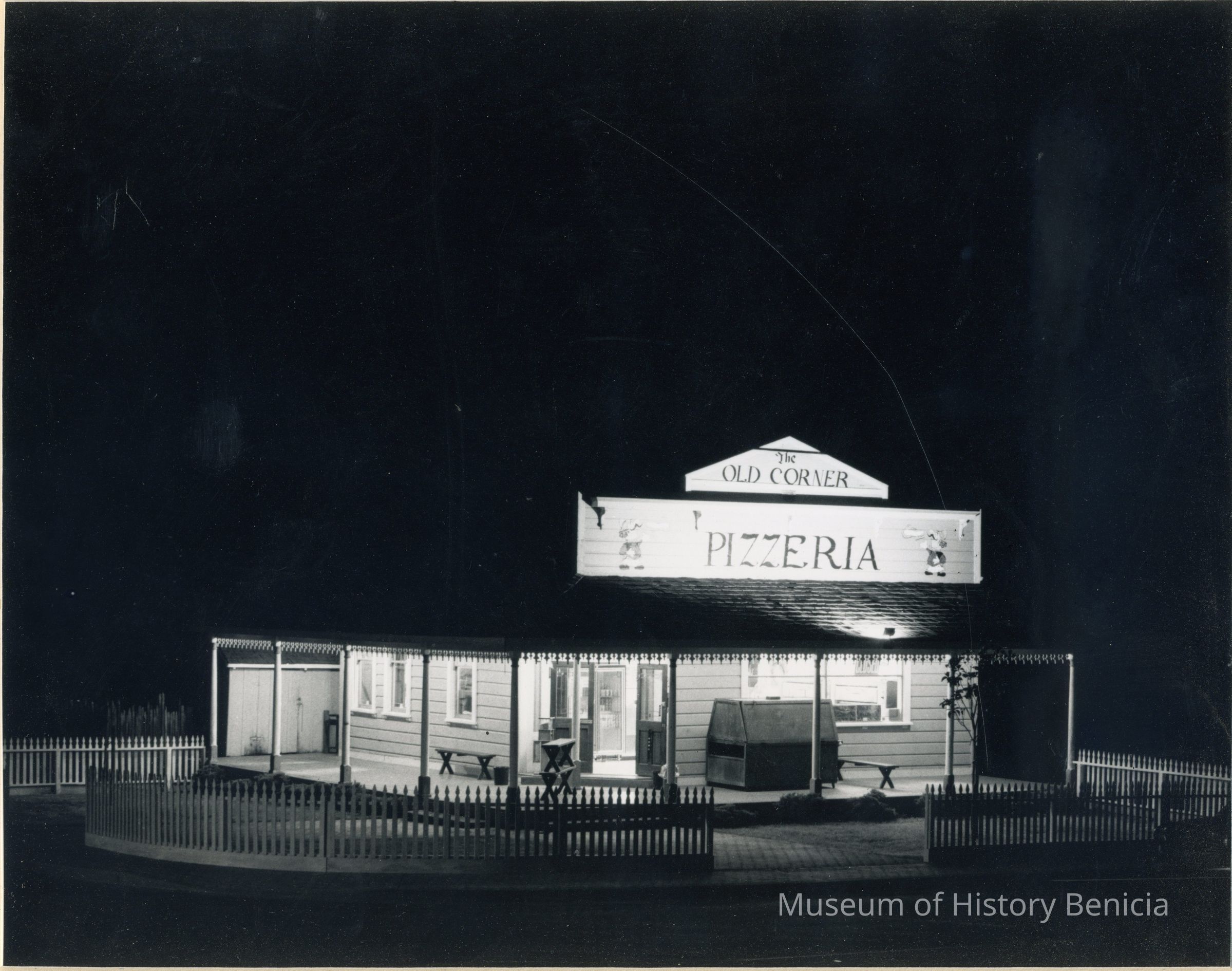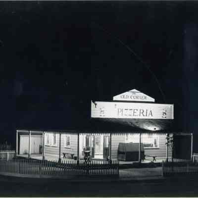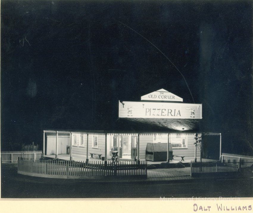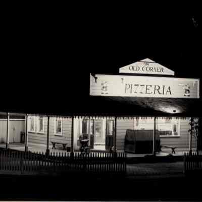 The old corner pizzaria at west 6th and K streets. The business originally was a small grocery store. Black and white photo.