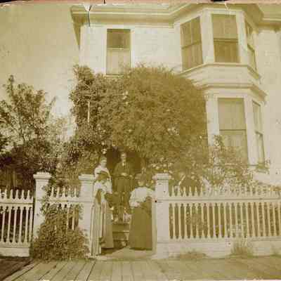 A photo of a two story house with a man, three women and a dog standing by the front gate. The side of the photo has been damaged. The tag that was with this photo says this is the George Hastings house when the Ripsom's lived there. I assume the people are William Ripsom's family as the older man looks like the man in photo 2014.011.0370 who is identified as William Ripsom.