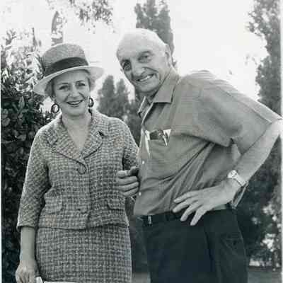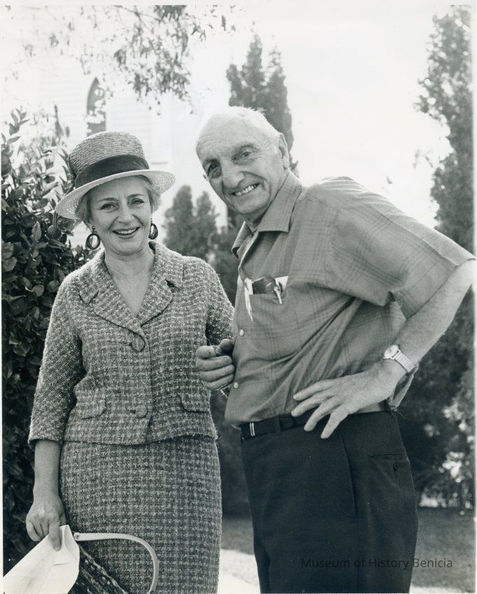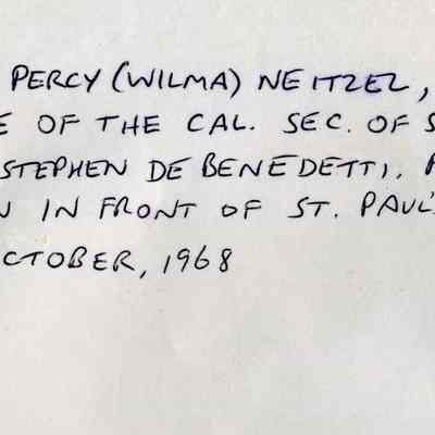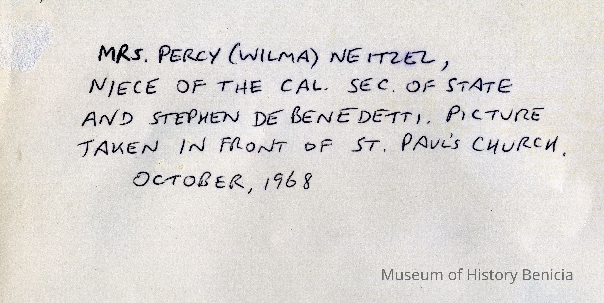 B/W photograph of Steve DeBenedetti (local Benicia historian) and Mrs. Percy (Wilma) Neitzel (niece of the California Secretary of State). Taken in front of St. Paul's church in Benicia on 10/1968.Collection