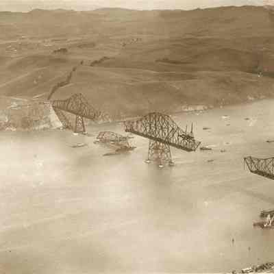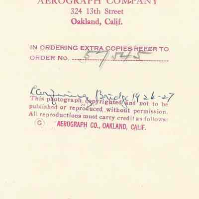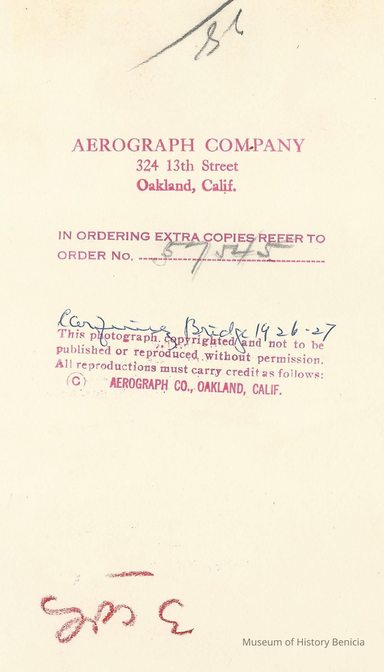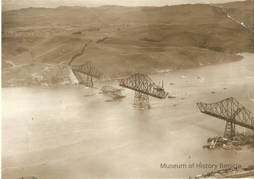 B/W aerial photo of Carquinez Bridge under construction. One section being raised and another missing. Vallejo in background. Same stamp and note on back as P3008.Collection