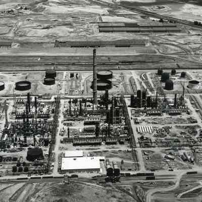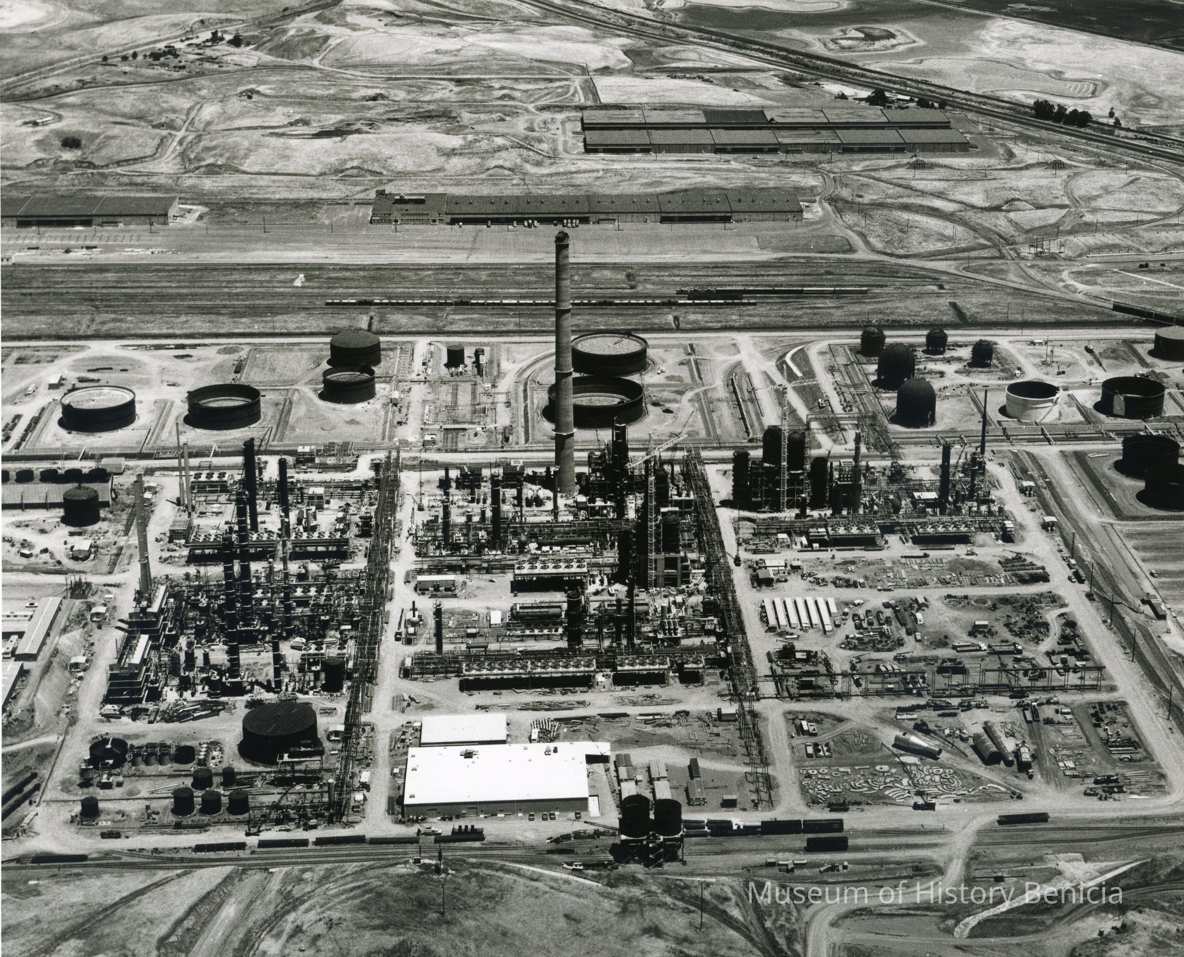 B/W aerial photo construction of Humble Oil Refinery (later Exxon and Valero) looking north but focused downward on refining area; across top: East Second Street, warehouses, empty areas, hiway 680; across lowe portion: storage tanks, refining equipment, stacks, pipelines, support structures, storage buildings, piles of building materials, vehicles, empty areas.Collection