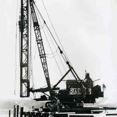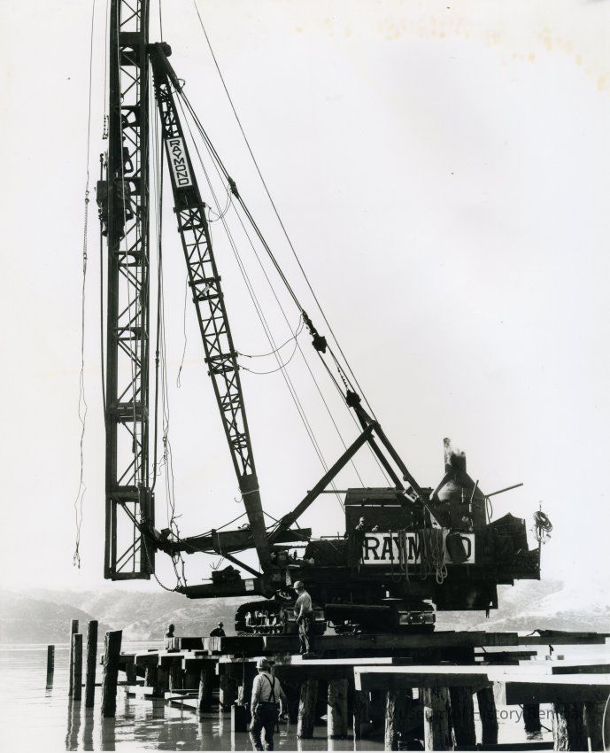 B/W photo of drilling/pile driving equipment/crane on a wooden pier, five men appear in the photo; hills on south side of Carquinez Strait can be seen in the background.