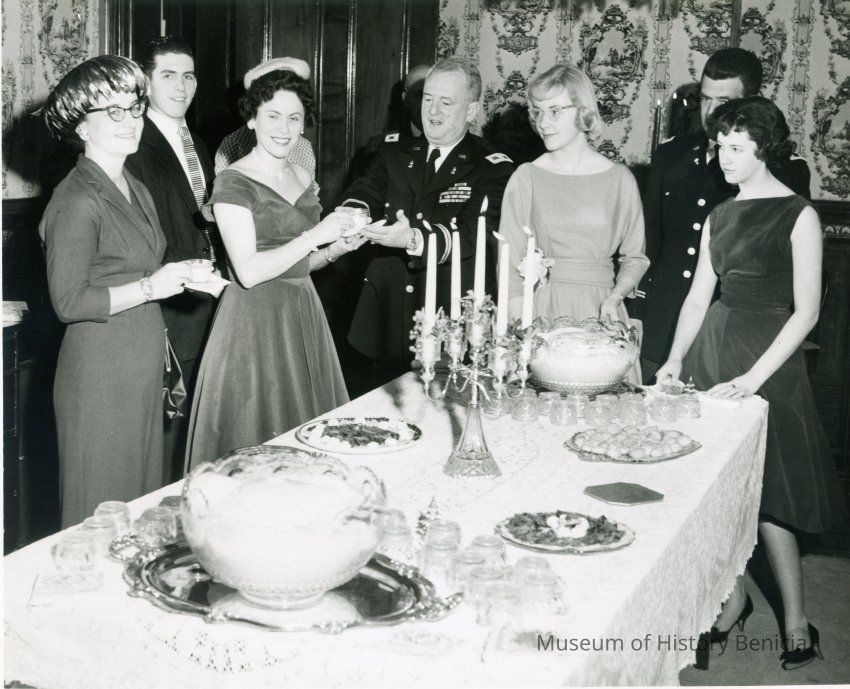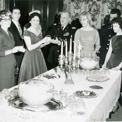 Social affair in Col. and Mrs. Wells' quarters. Amy Gordon on left, Mrs. Wells, Col. Wells, Lt. Col. Giles Gordon on right, rear. Others are Curt Wells, second from left; Anne Gordon, fifth from left; and Faye Auger farthest right. Black and white photo.Collection