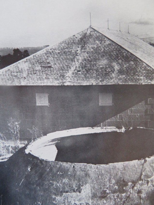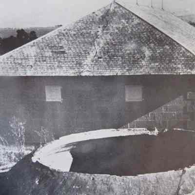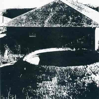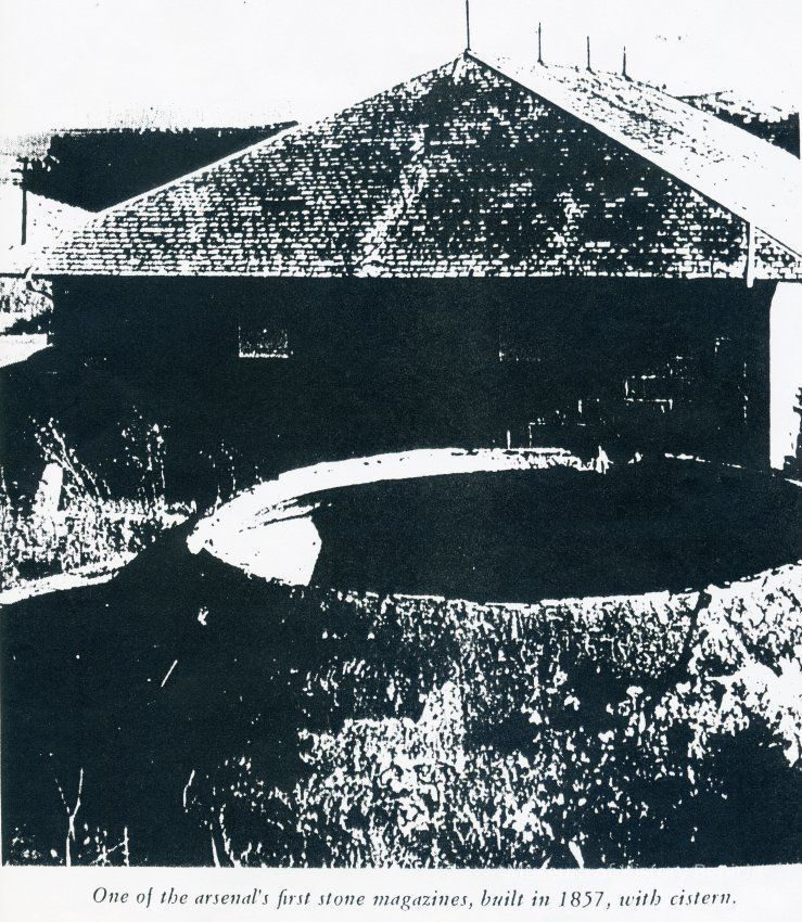 B/W photo of a photo at the Benicia Arsenal: The second stone Powder Magazine 10, built in 1857, with cistern.