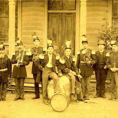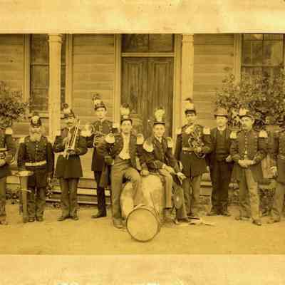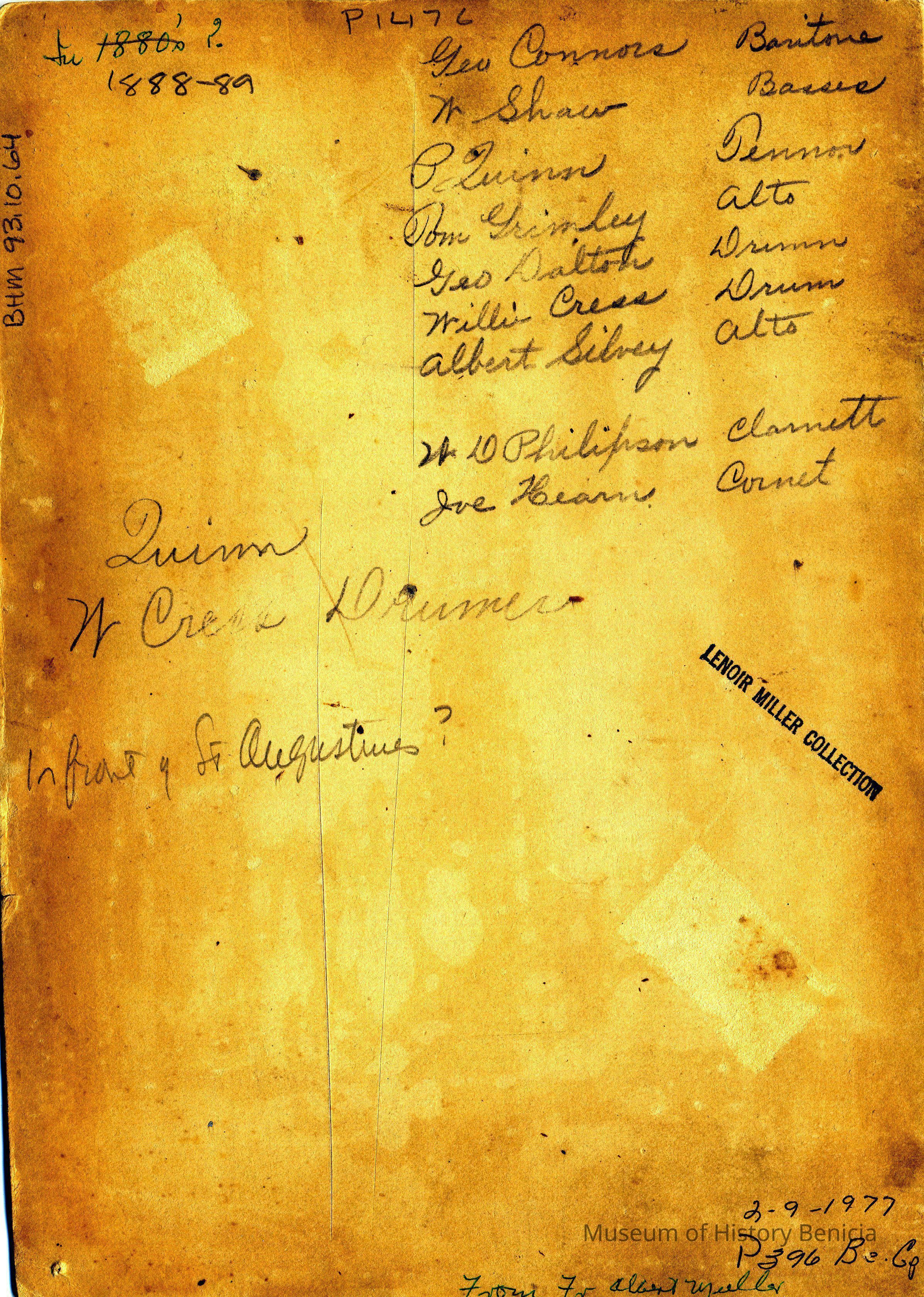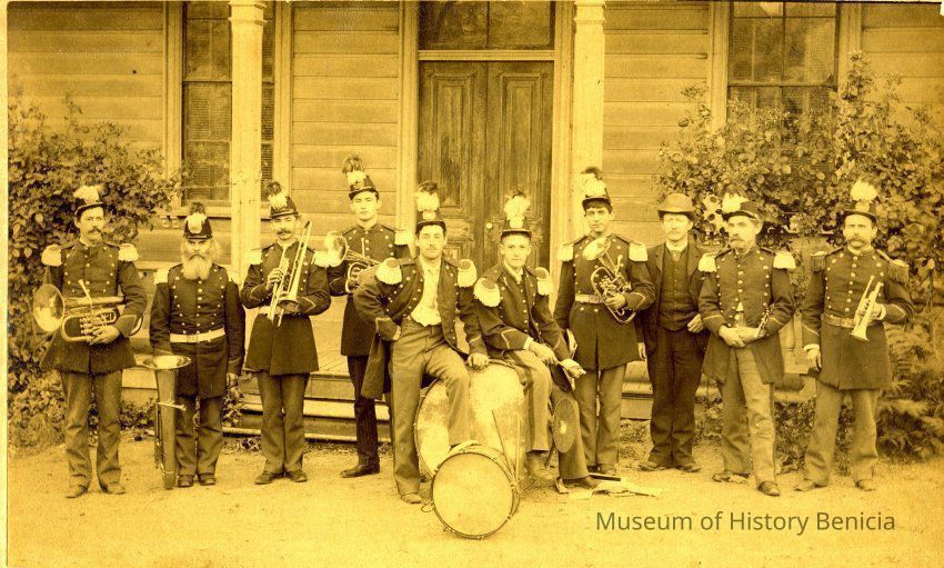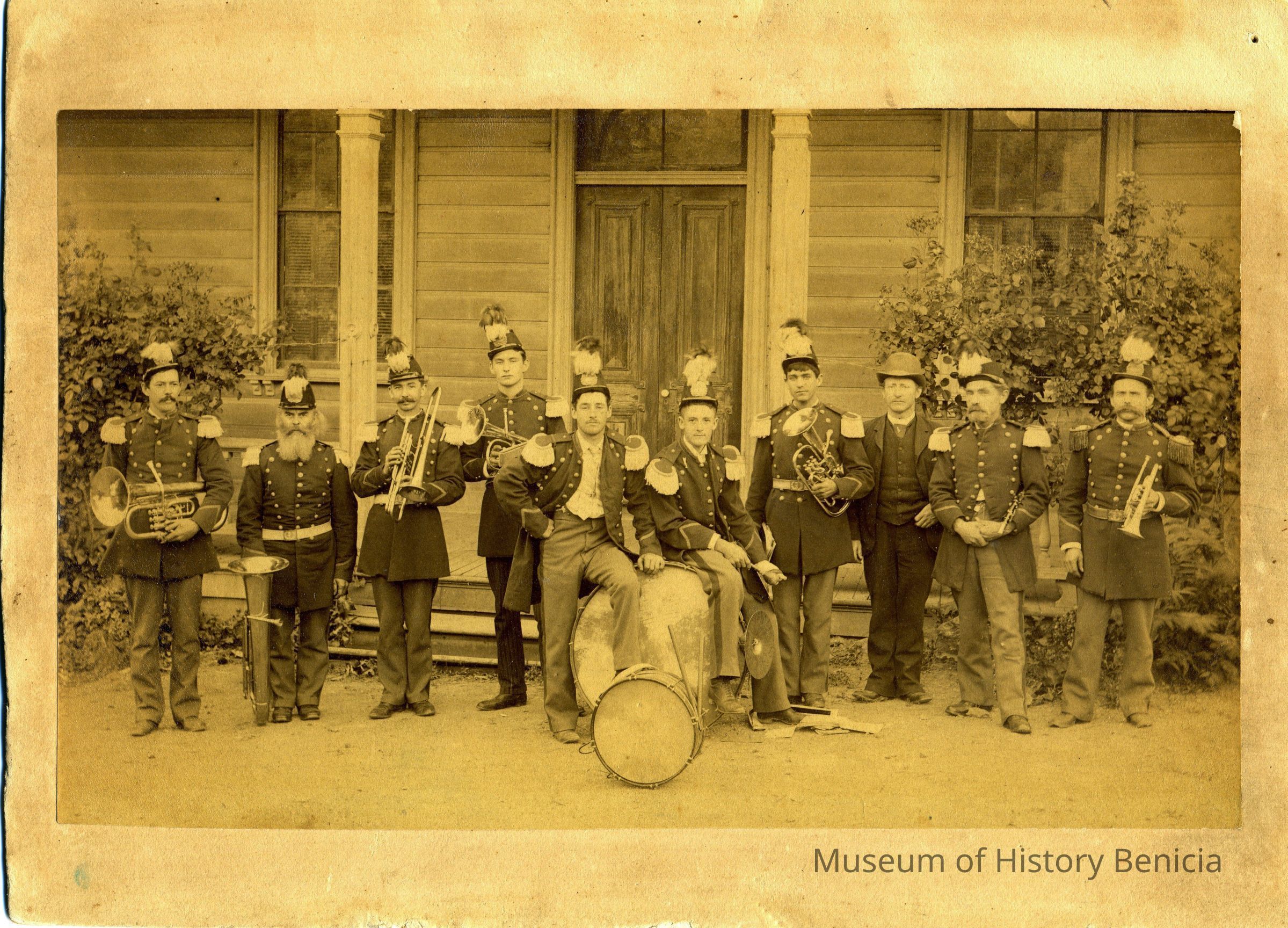 Benicia Band Players: George Comors, baritone; W. Shaw, baritone; P. Quinn, tenor; Tom Grimley, alto; George Dalton, drum; Willis Cress, drum; Albert Silvey, alto; D.W. Philipfson, clarinet; Joe Hearn, cornet. B/W photo.Collection