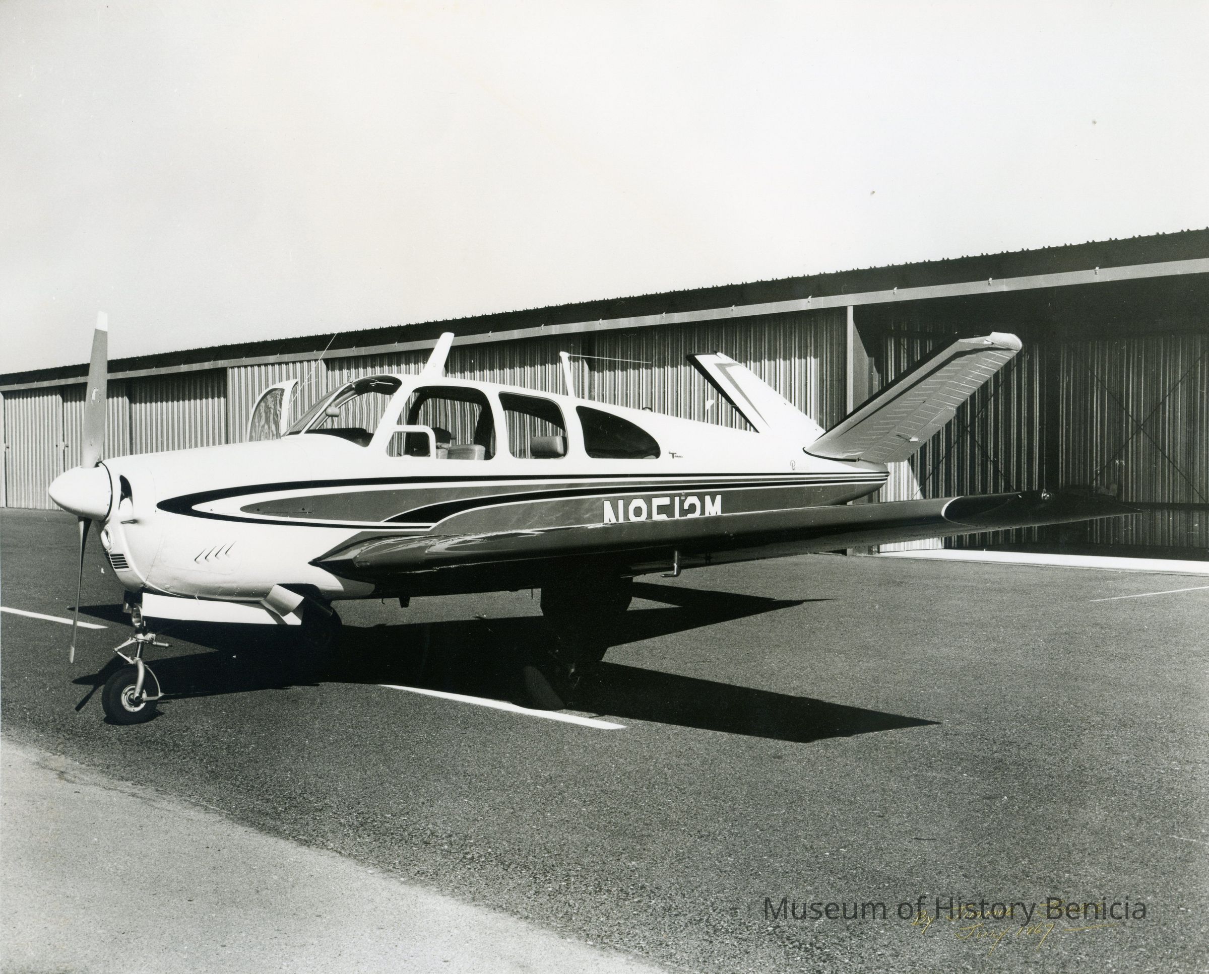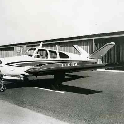 B/W photo of a small propeller driven airplane; perhaps the one used to take aerial photos of the Humble Oil construction project; there is a number on the side which is partially obscured by the left wing. (N8513M?)Collection