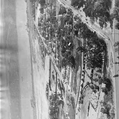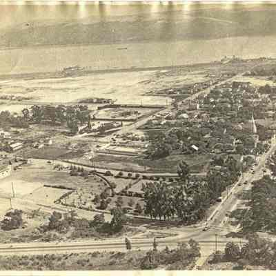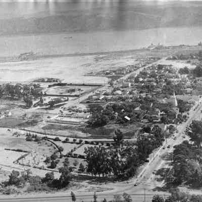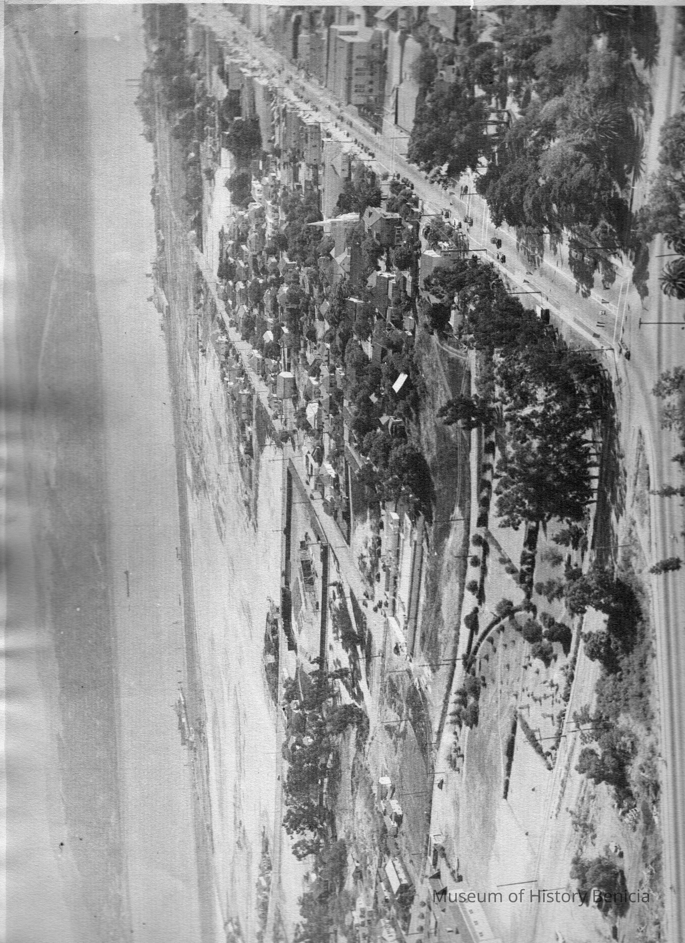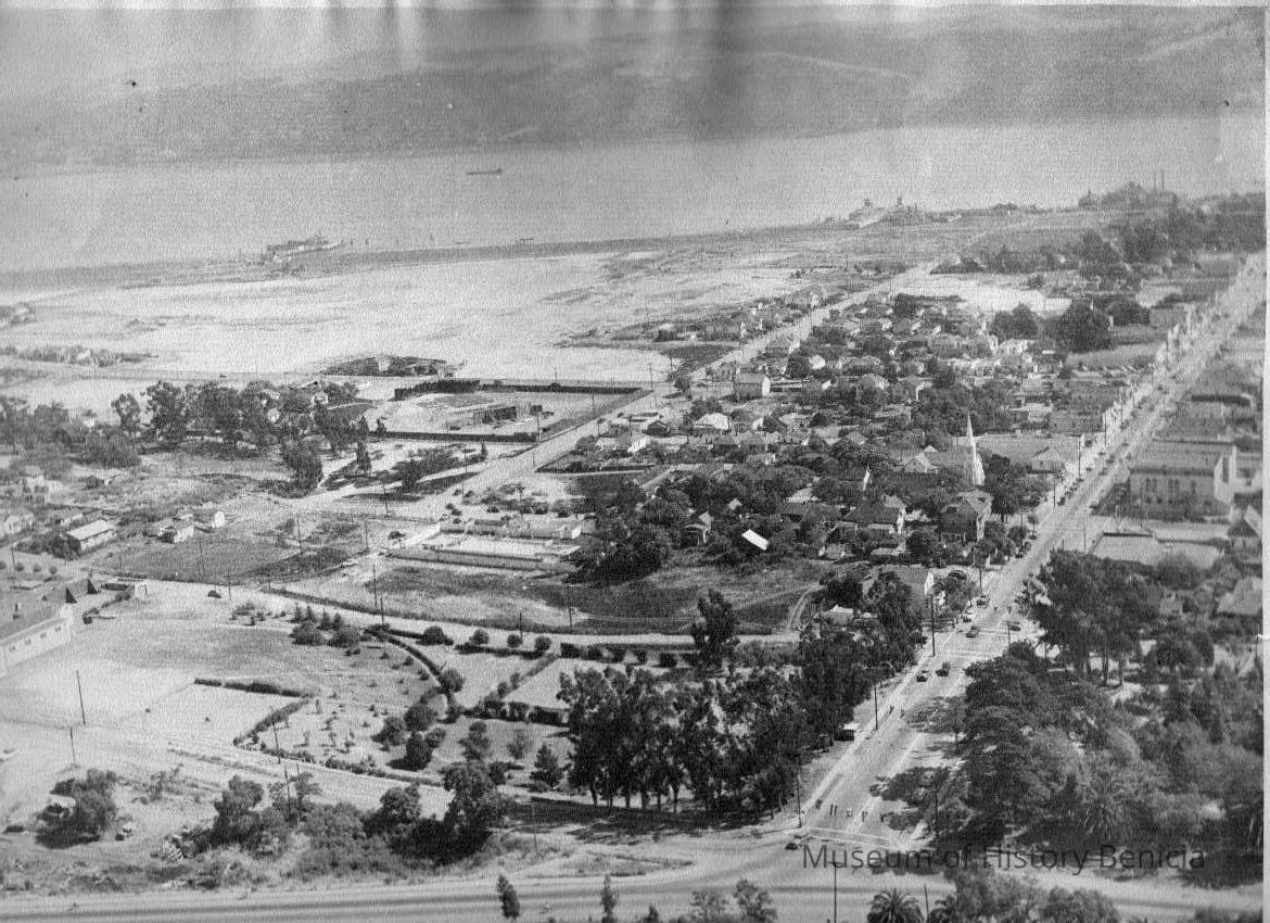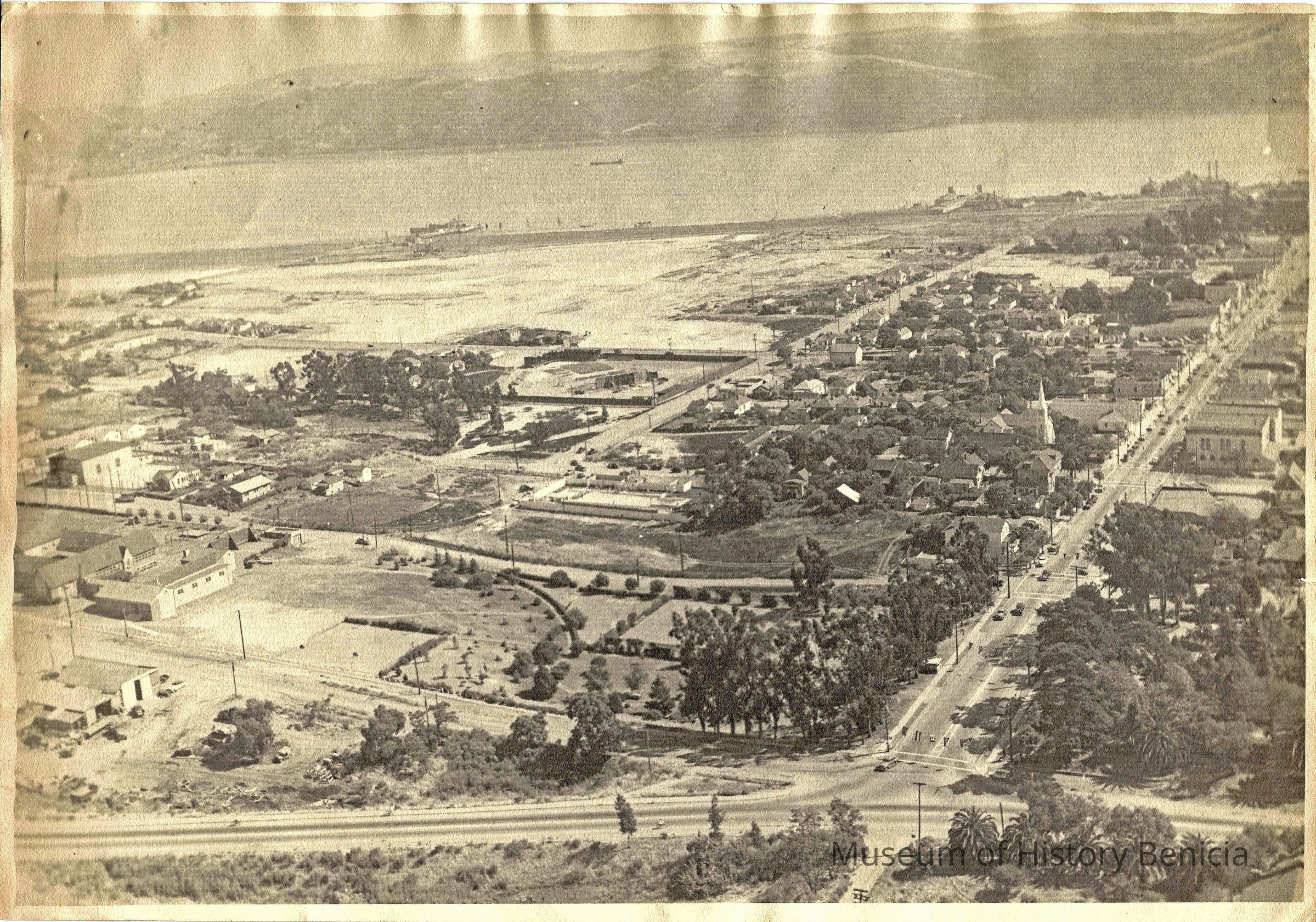 Black and white view of Benicia looking south. Photo shows First Street, High School (now City Hall), swimming pool, and ferry docks.Collection