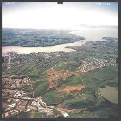 Aerial photo of Benicia looking south West from 8,500 Ft. Black and white photo.