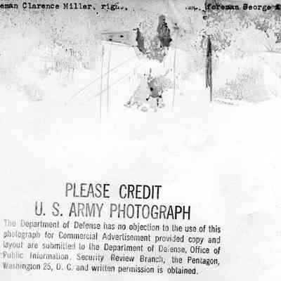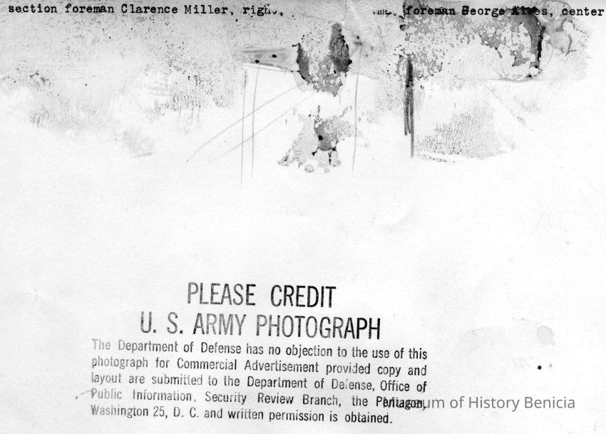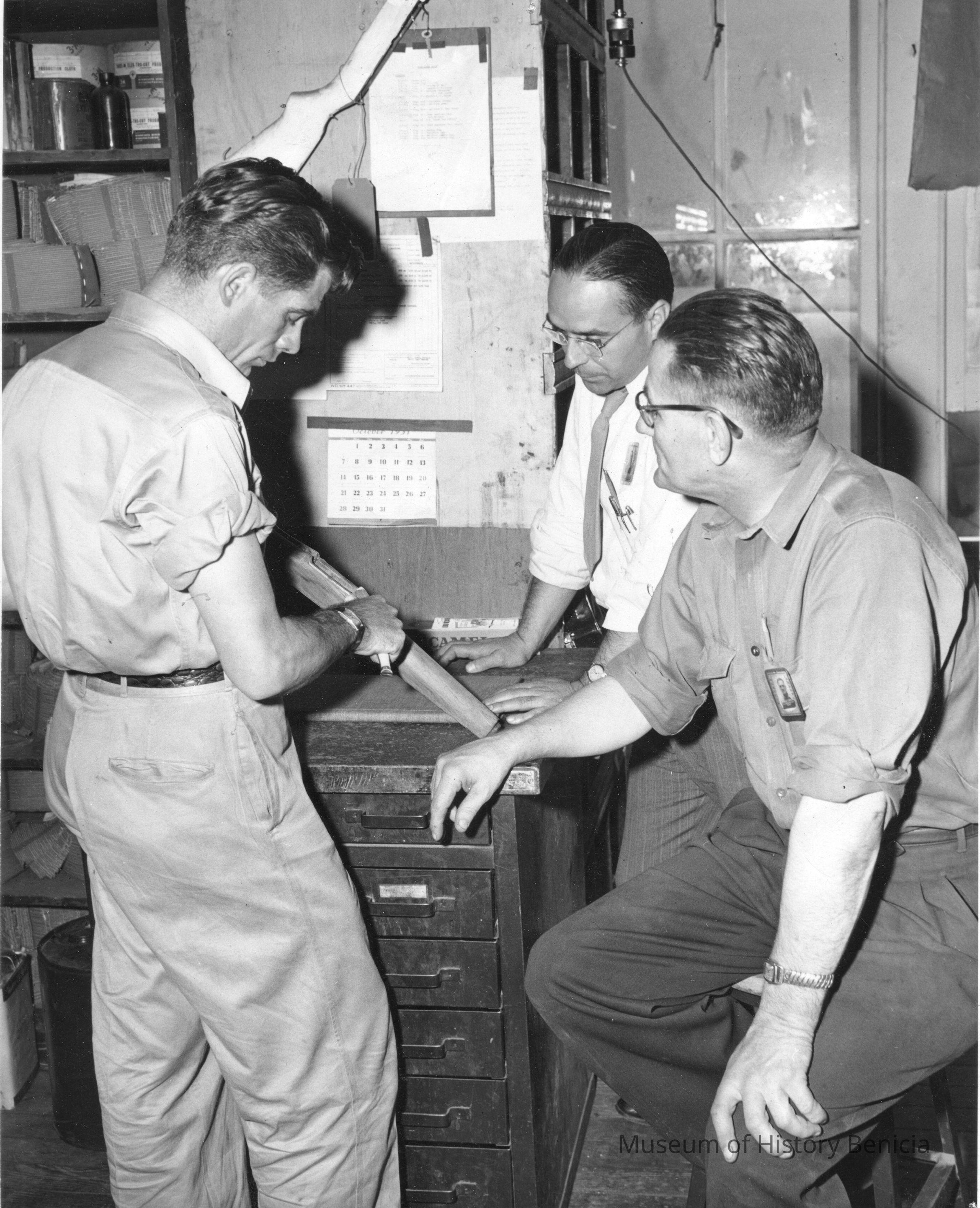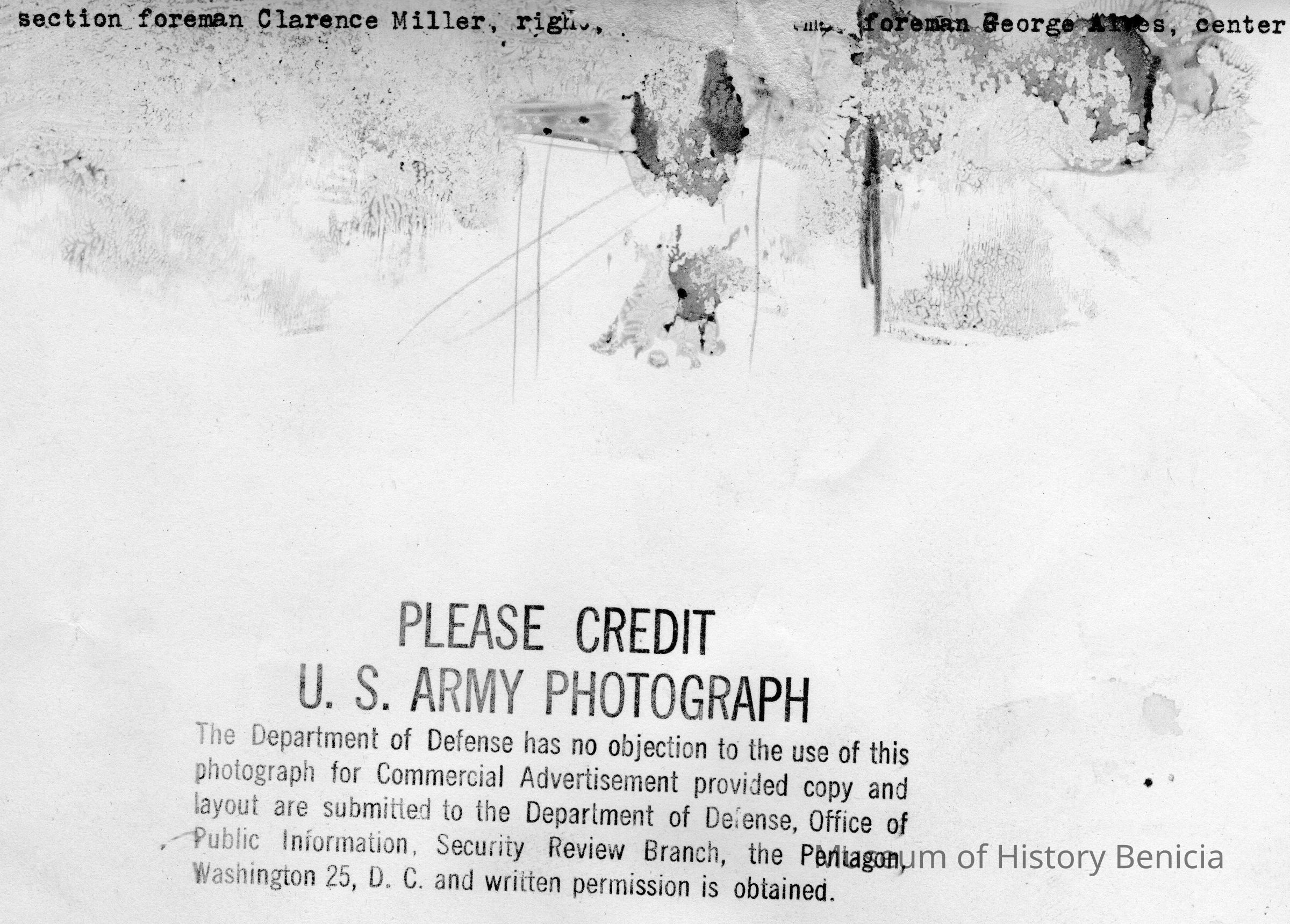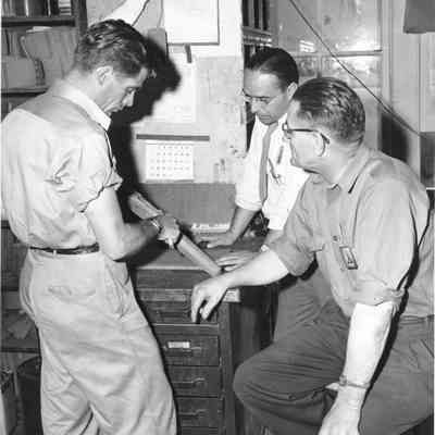 Photo from the Arsenal. Photo taken by the U.S. Army. Names are typed on the back. Section foreman Clarence Miller (husband of Mildred McClain Miller ?), right __________, foreman George Alves center. Calendar seems to be for December, 1937.Collection