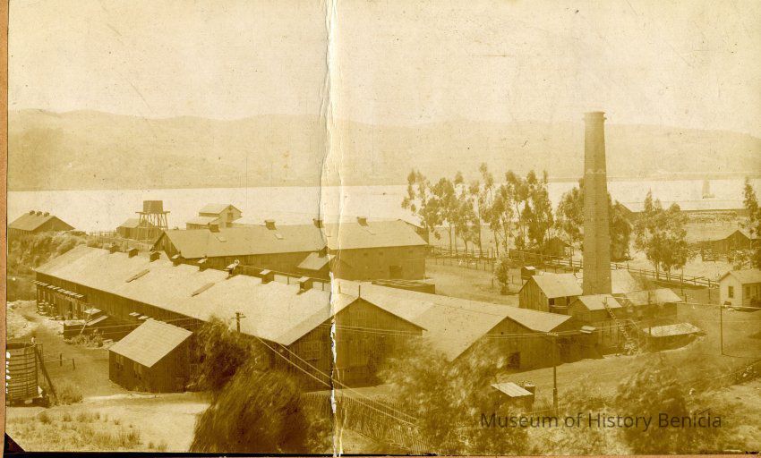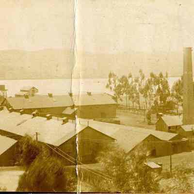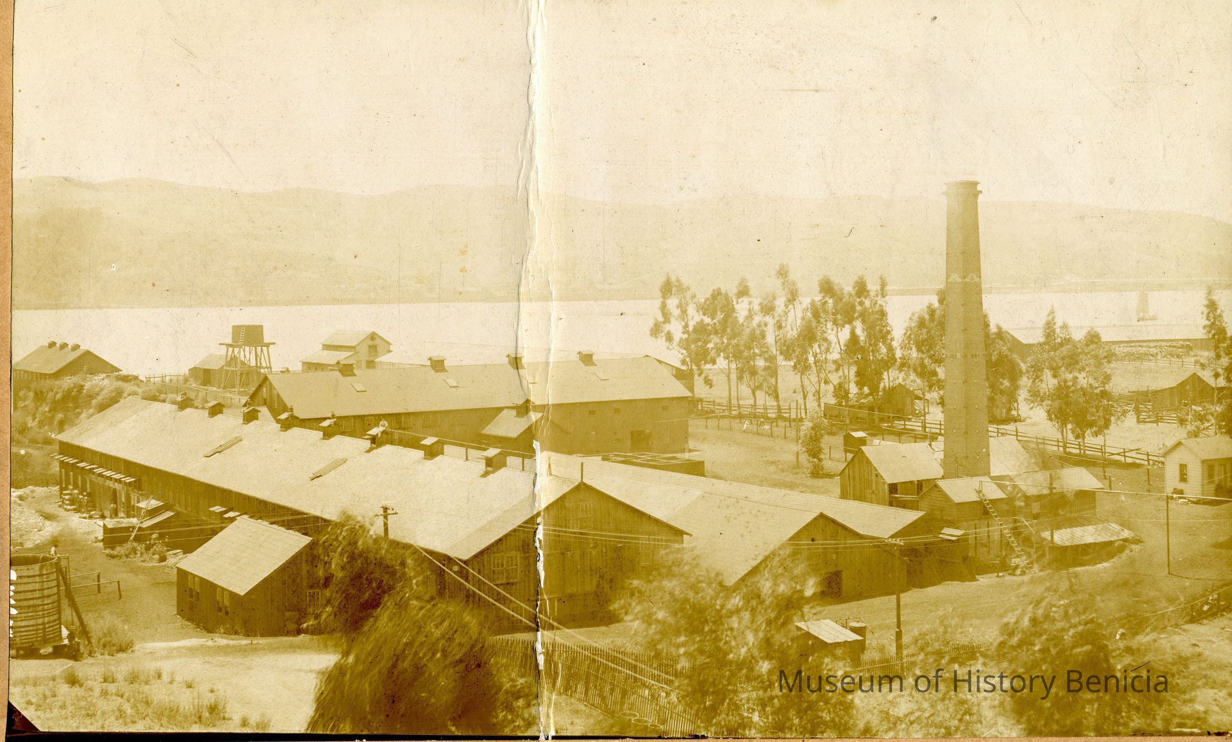 Photo of Benicia industry. It is taken near the straits and has multiple buildings and a large smokestack in the middle. Several men are posed on the roof of the nearby building. Not sure what business this is. It doesn't have stacks of hides sitting around so I don't think it's a tanners.Collection