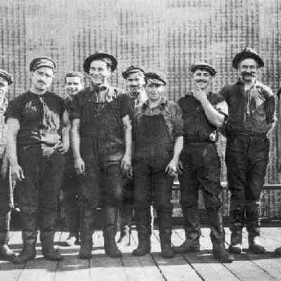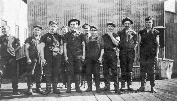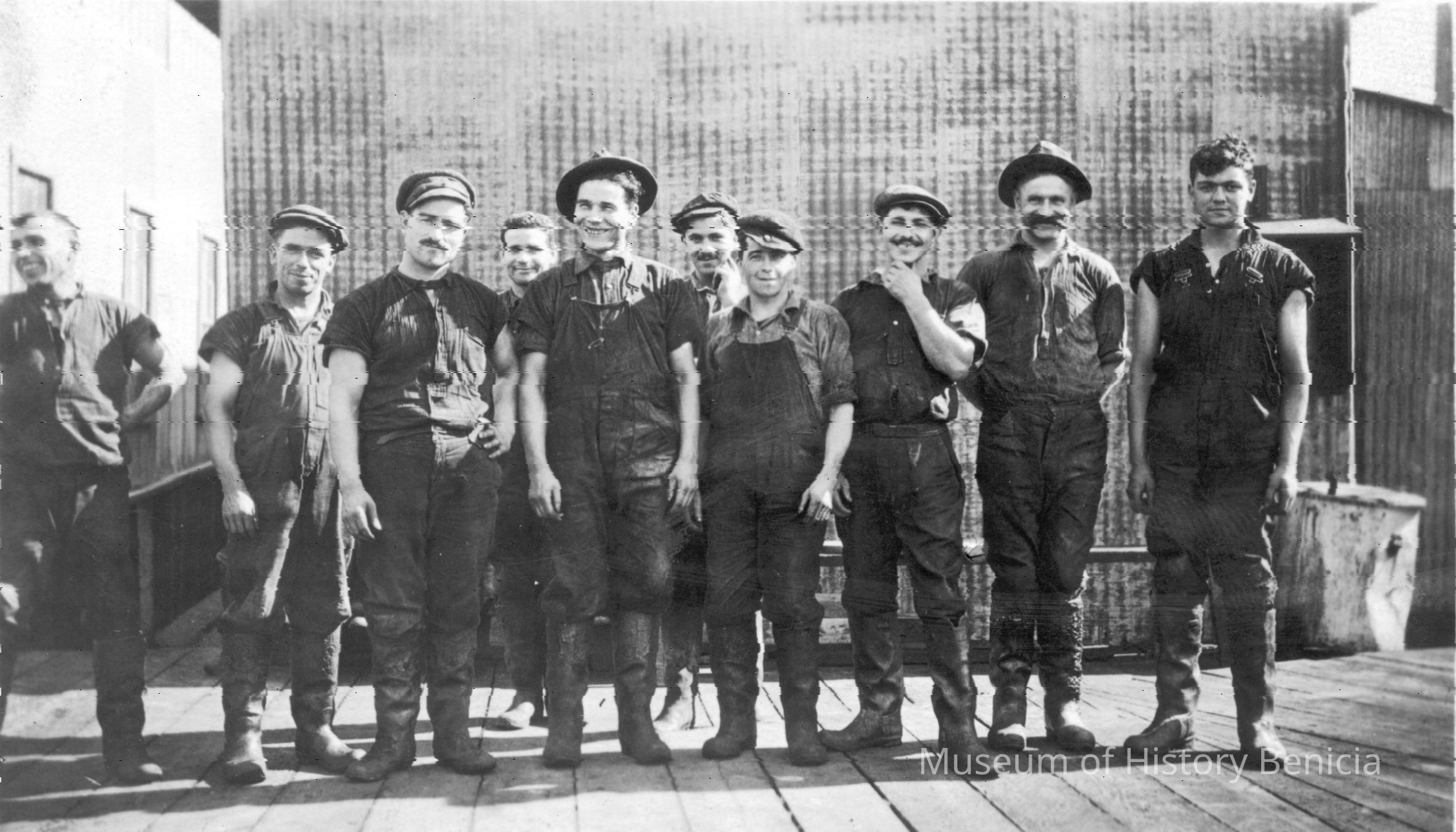 B/W photo of ten men in work clothes by metal building. "Santos-- 1, Gorgebas[?]-- 1, Peraltra[?]-- 1, Balsana-- 1, Ricardo Da Silva-- 1, Amada-- 1, Joe Lucas-- 1" on back in pencil.Collection