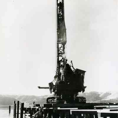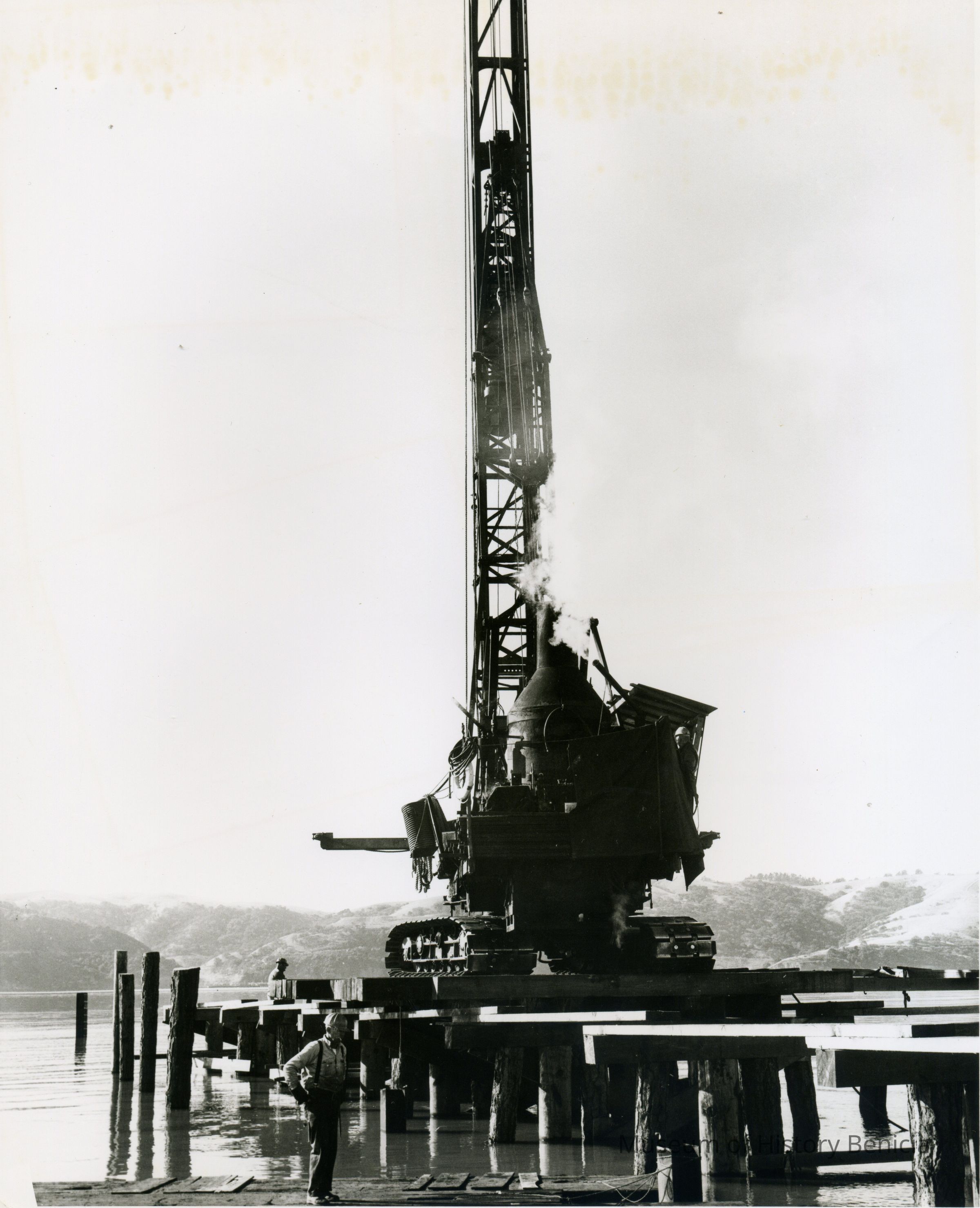 B/W photo of drilling/pile driving equipment on a wooden pier; hills south of Carquinez Straits appear in the background; two men in hard hats can be seen in the photo.