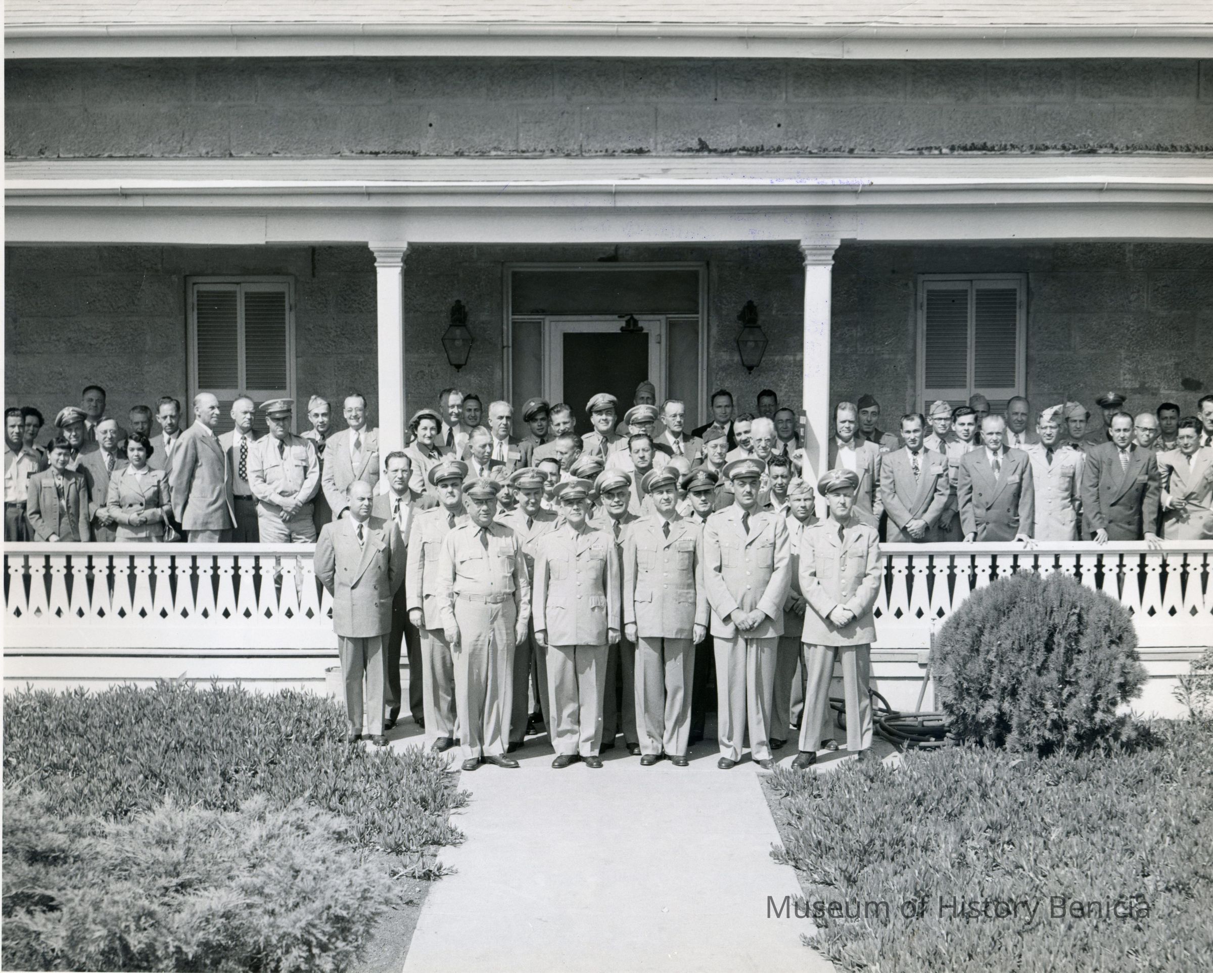 Black and white group photo. Men and women in uniforms and civilian clothes standing on porch and steps of Bldg. 1. "9106-239-1/am-51" in pencil on back. Possibly foreign officers in front.Collection