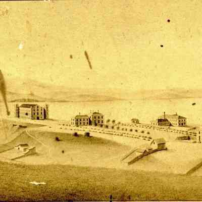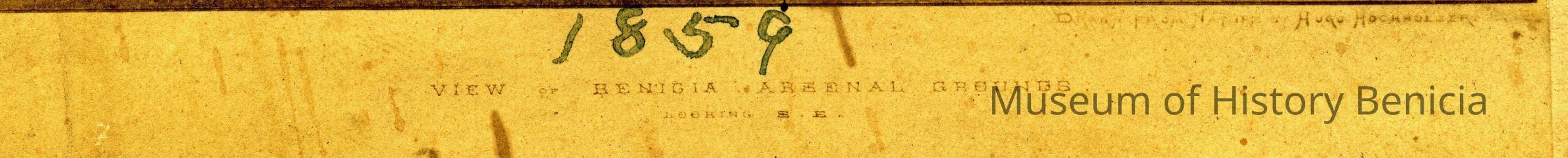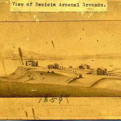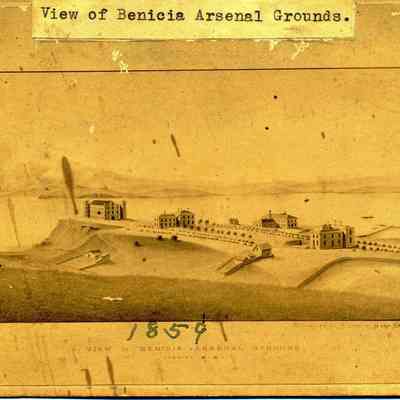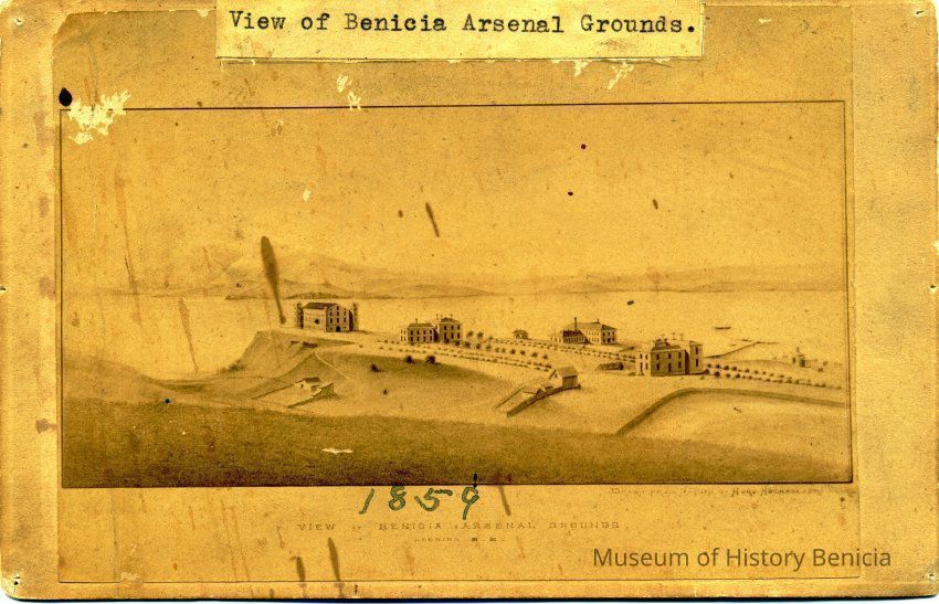 Photo of a lithograph of the Benicia Arsenal in 1859. The caption says "View of Benicia Arsenal Grounds". The creator is Hugo Hochhuleer who "drew the scene from nature".