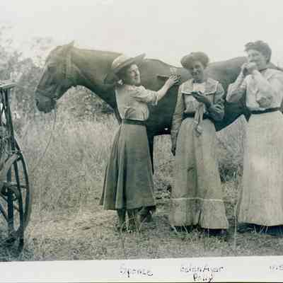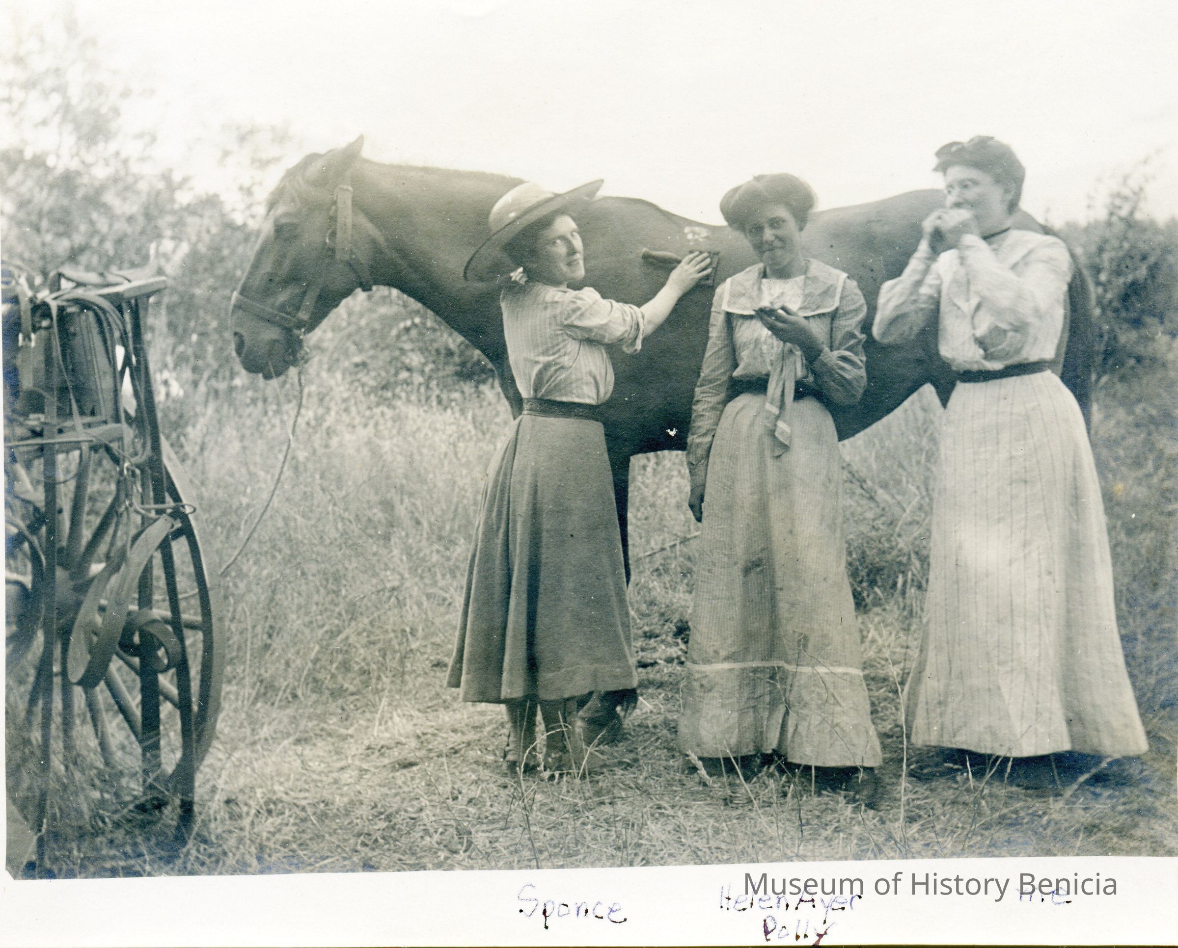 The photo is of three women next to a horse. The names mentioned are Sponce, Helen Ayer Polly, me"Collection