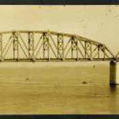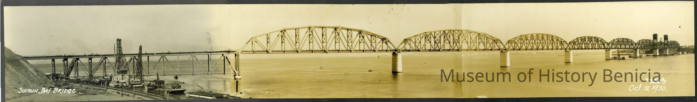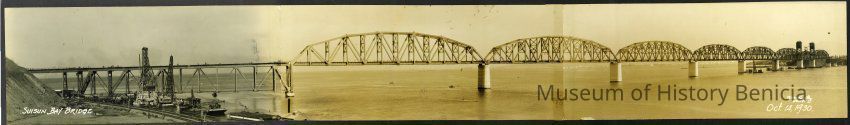 Benicia-Martinez Bridge under construction--official photo showing progress of Southern Pacific Railroad Bridge (B/M). Black and white photo.Collection