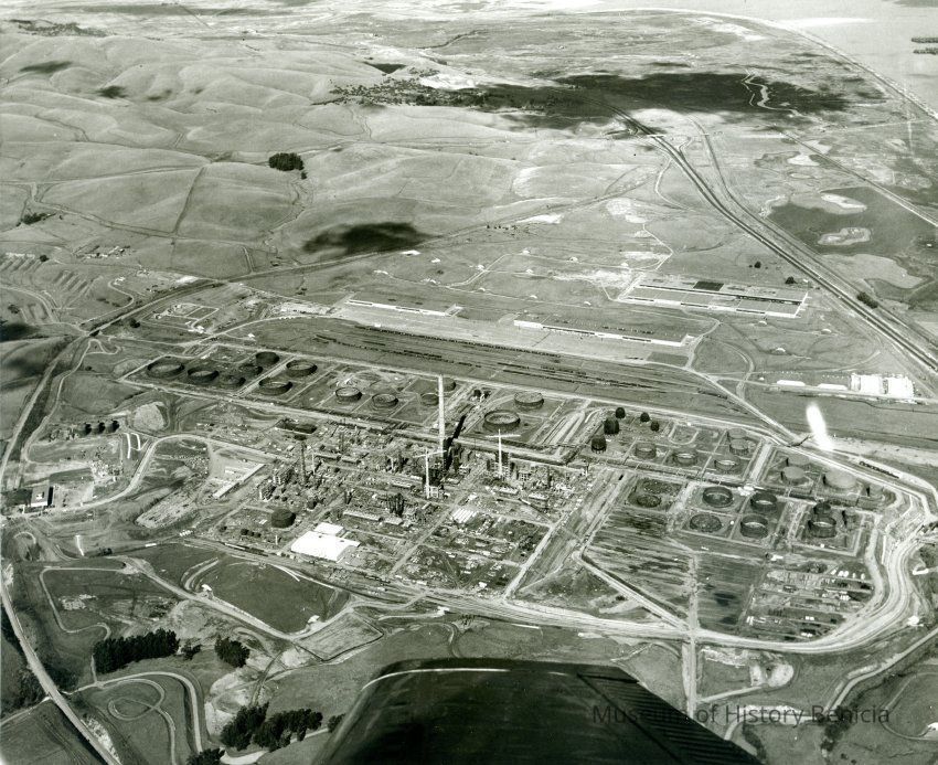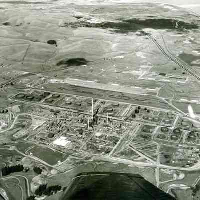 looking north: across the top: empty hills dissected by East Second Street and hiway 680; across center: administration building, storage tanks, refinery equipment, tall smoke stack (in center) cranes, warehouses, in-ground bunkers, access roads, railroad cars on sidings; an airplane wing tip is visible at the bottom.Collection