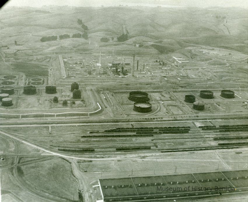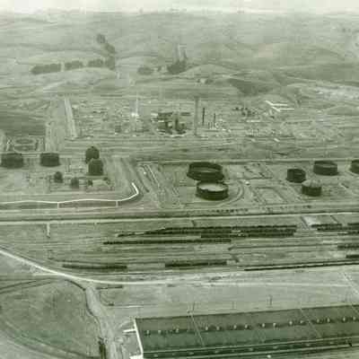 looking west: (hazy conditions) across top: empty hills, East Second Street; across above center: storage tank pads, refinery equipment and smokestack being assembled, 2 buildings and graded areas; across center: storage tanks nearing completion; across below center: railroad cars on sidings; across bottom: graded area, warehousesCollection