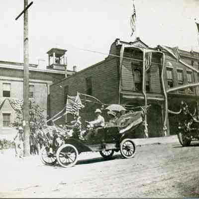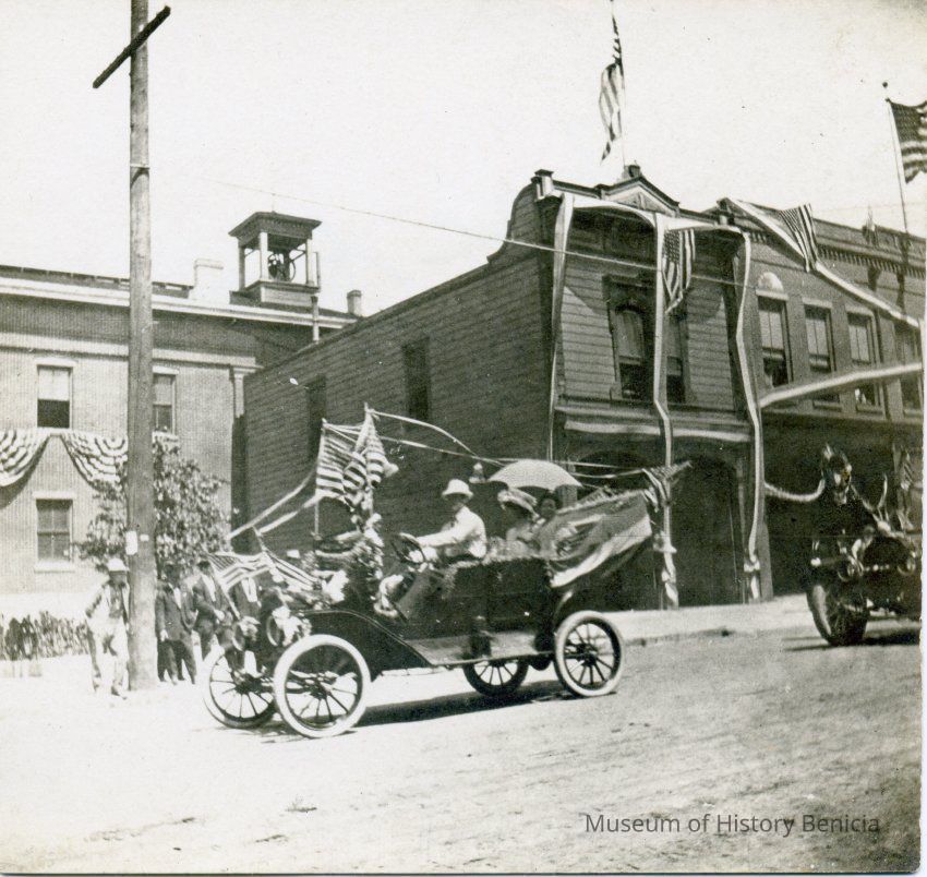 Photo of a 4th of July parade in Benicia with a decorated car going by the State Capitol. On the back it says "Fire House", which was built from the side of the State Capitol.Collection