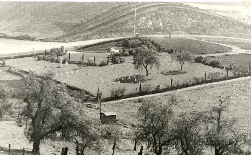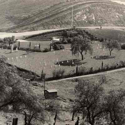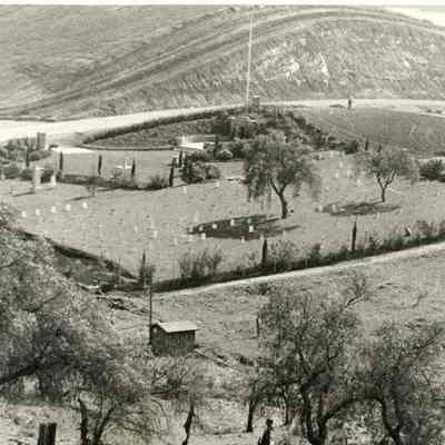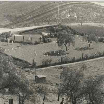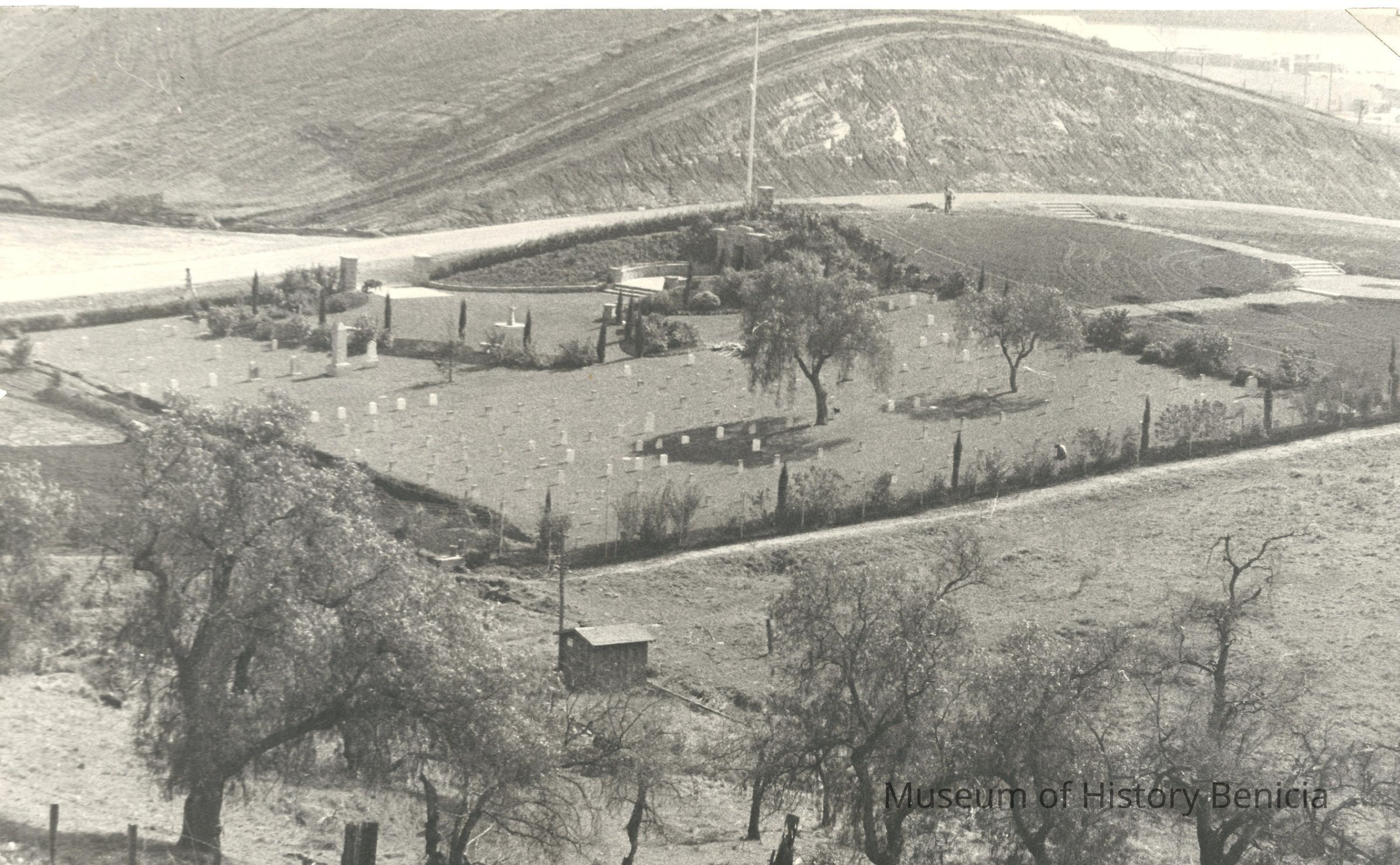 B/W photo of central portion of Military Cemetery in Benicia. Well house in foreground.