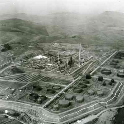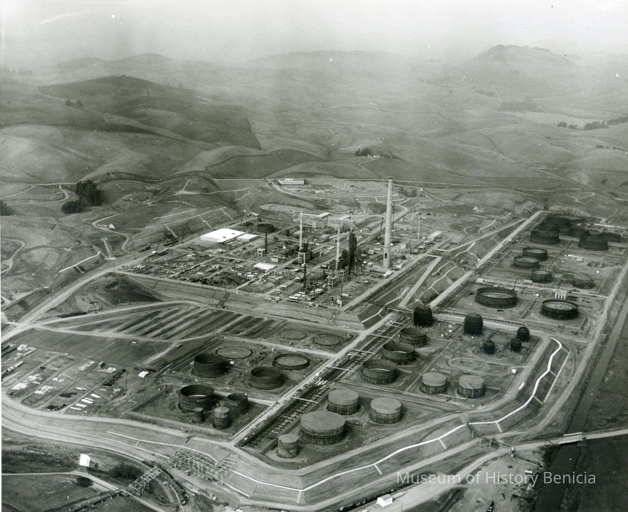 looking west: across bottom and up right side: storage tanks (some complete); in center: refinery equipment being assembled, various towers, tall smoke stack, buildings and vehicles; above center: East Second Street and administration building; across top: empty hills.Collection