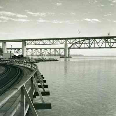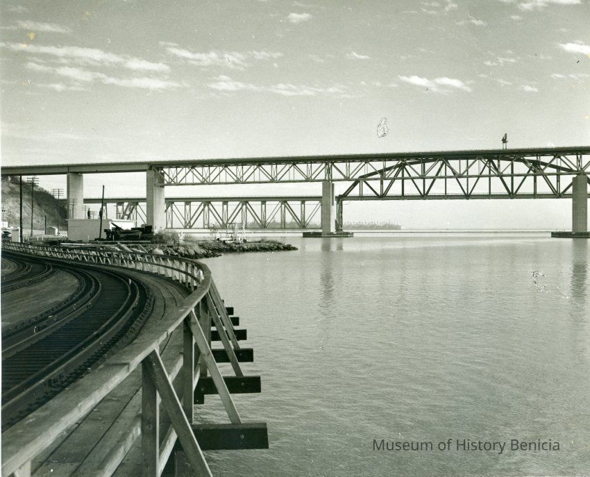 B/W photo Carquinez Strait shoreline south of Benicia/Martinez and SP Railroad bridges; possible dock site, railroad tracks on wooden trestle at photo left, water at right