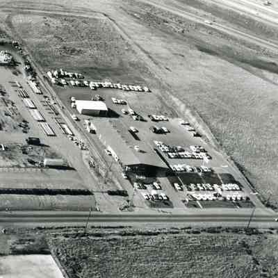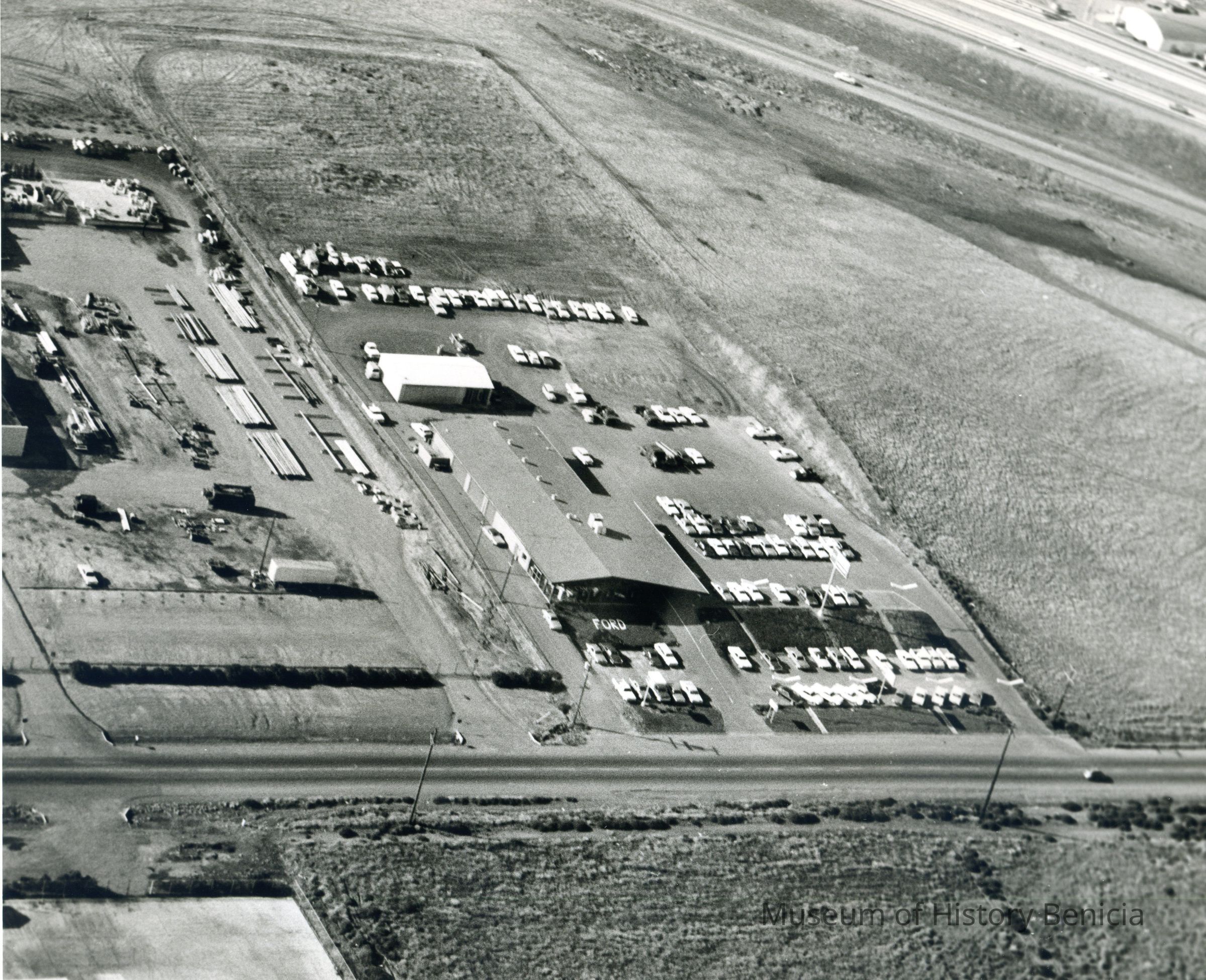 B/W aerial photo, envelope identified as "Dick Lewis Ford, Peabody Road, Vacaville", shows auto dealership, cars, buildings, surrounding fieldsCollection