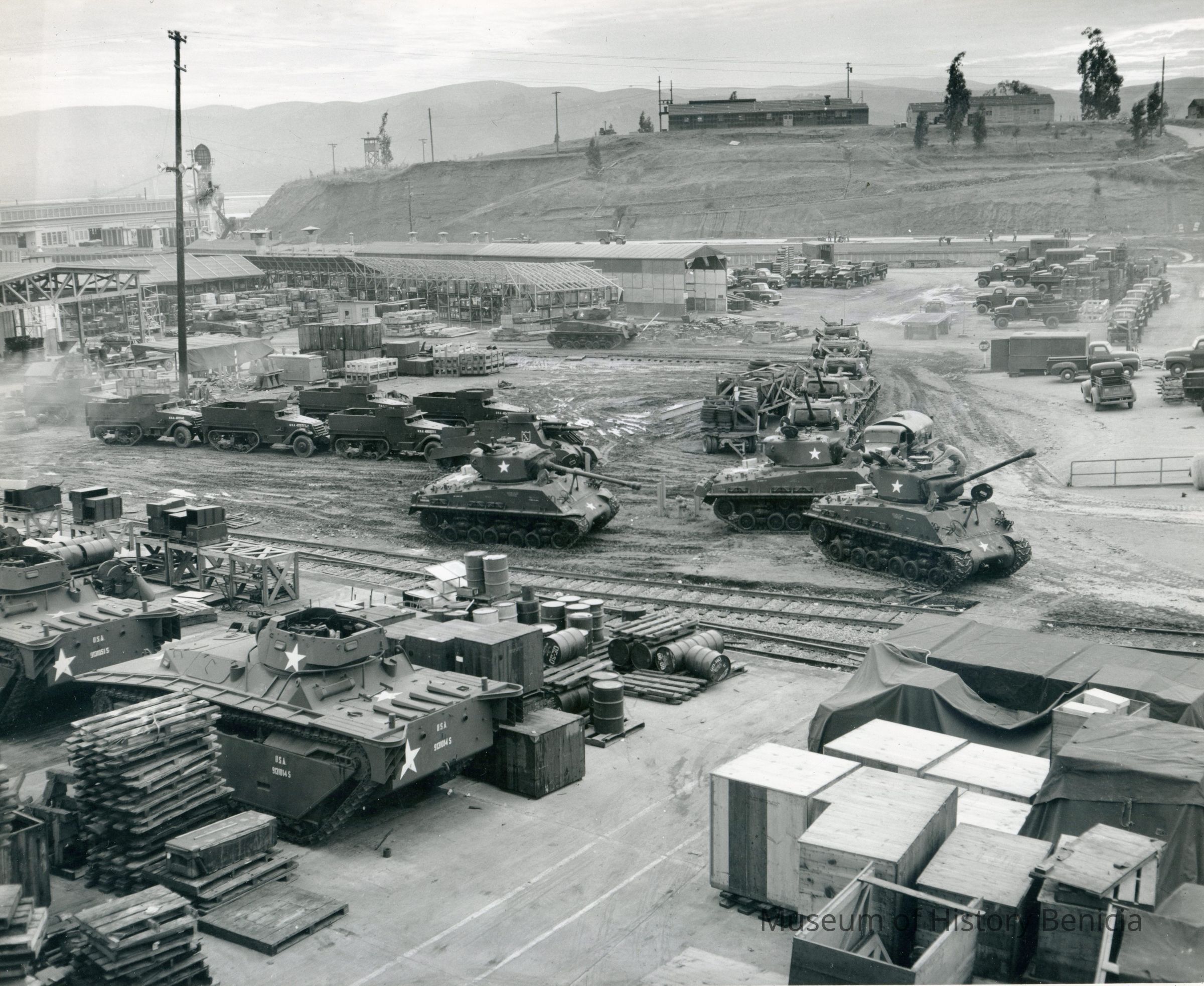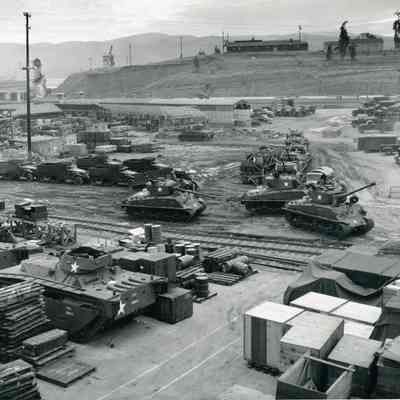 Photo from the Josephine Cowell research material. Shows Benicia Arsenal Yard and tanks being serviced. Photo was taken near tank shop and shows M4 Sherman tanks in the middle ground, M3 half-tracks at left center. Two self propelled howitzers visible at front left.Collection