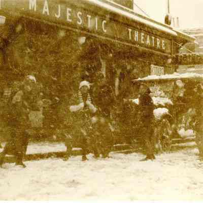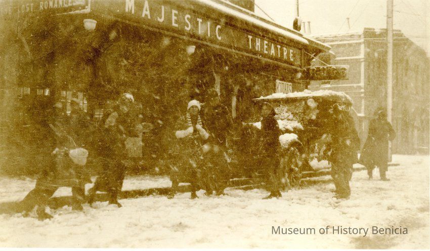 This is a photograph of Benicia during a snowstorm in 1921. It was taken in front of the Majestic Theater with kids and adults walking and playing. The movie at the Majestic is "Lost Romance" and there is a sign near the corner advertising "Kodaks" (this is probably at Hoffman's Drug store later changed to O'Grady's drug store).