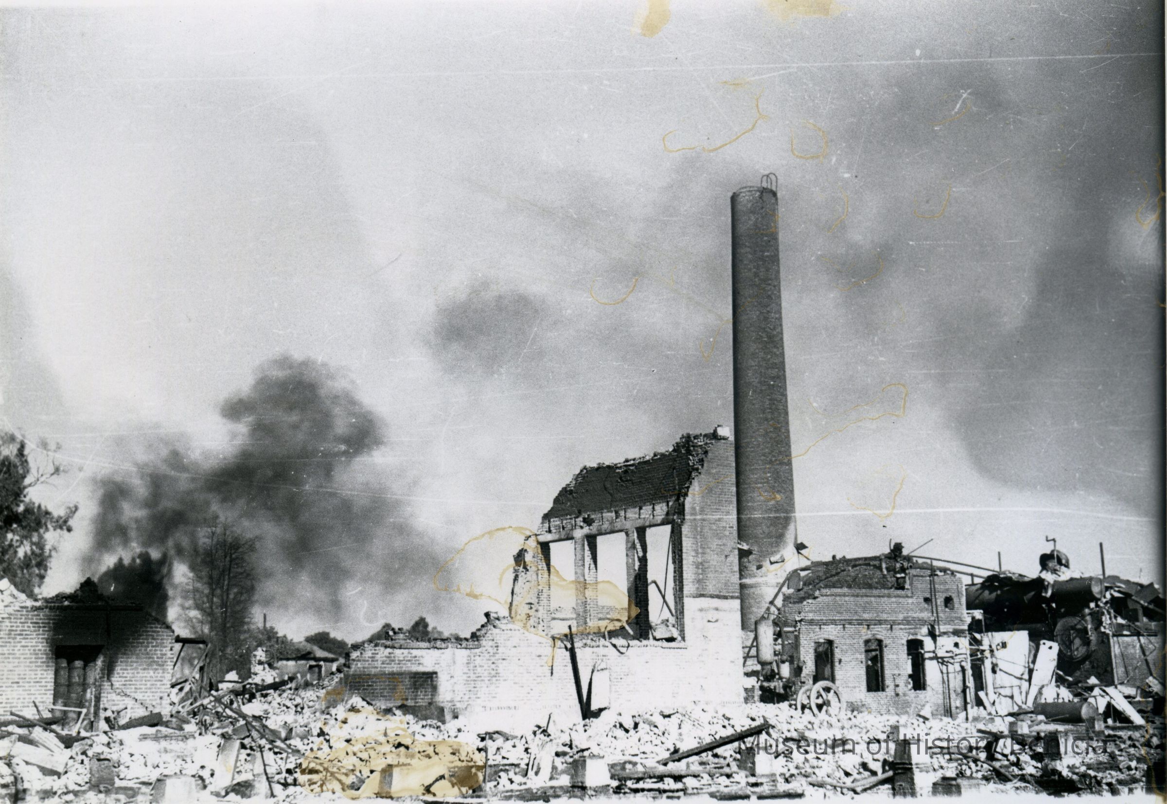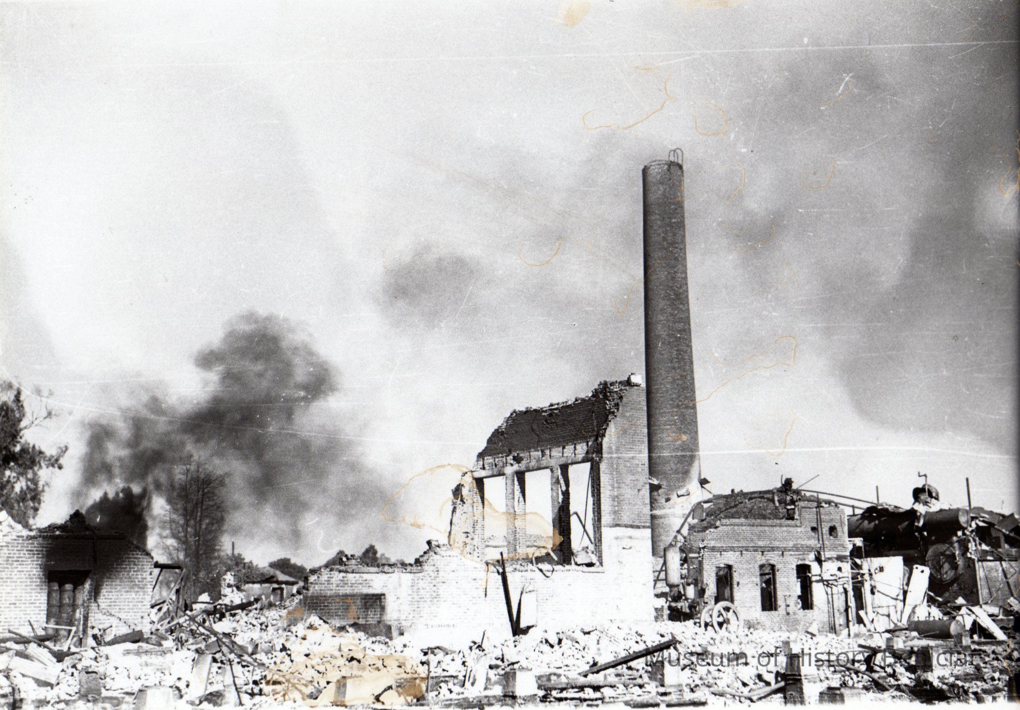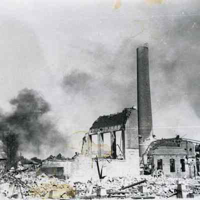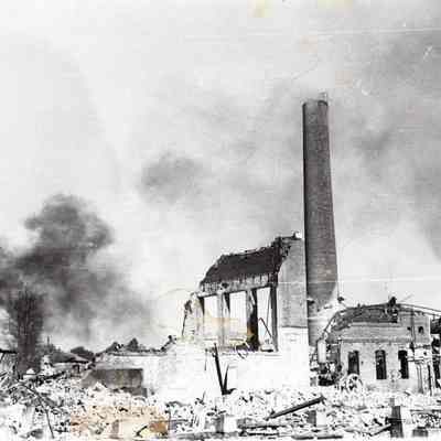 Kullman-Salz Tannery fire which destroyed the vacant tannery buildings in 1945. The Tannery had been closed since 1927. Black and white photo.Collection