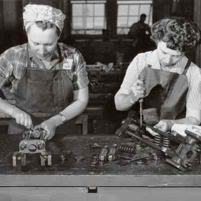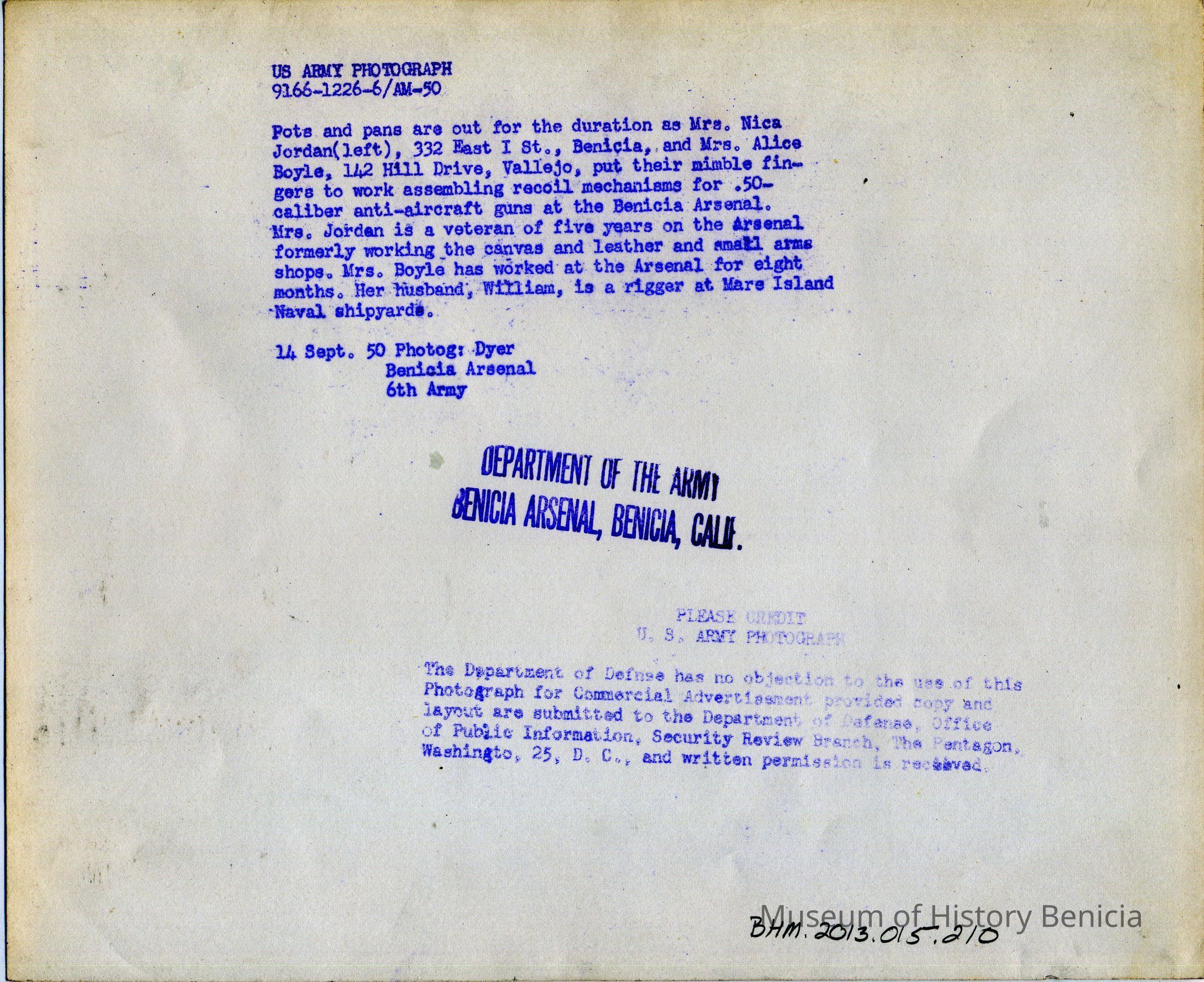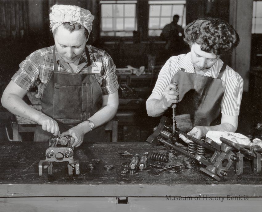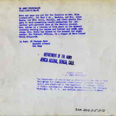 Photo from the Josephine Cowell research material. Shows women assembling recoil mechanisms for .50 caliber anti-aircraft guns. The women are named on the back; Mrs. Nica Jordan (left) of 332 East I st Benicia and Mrs. Alice Boyle of 142 Hill Drive Vallejo.Collection