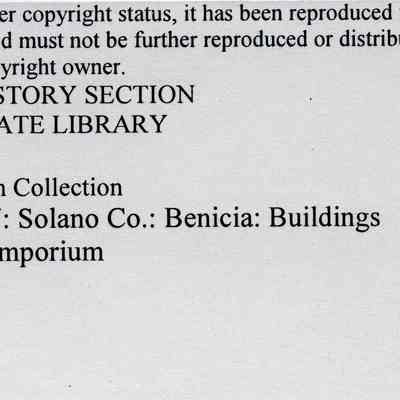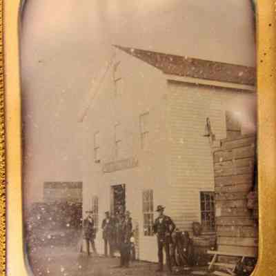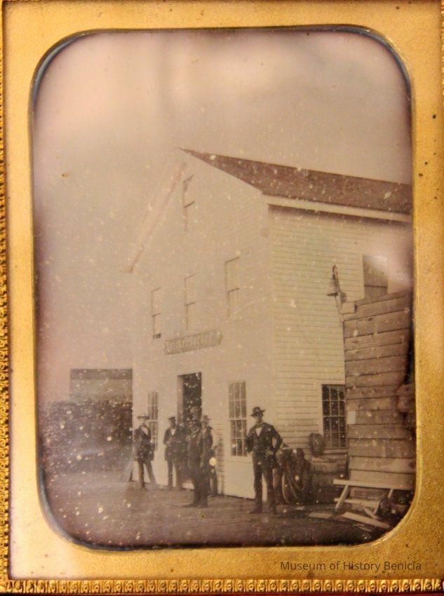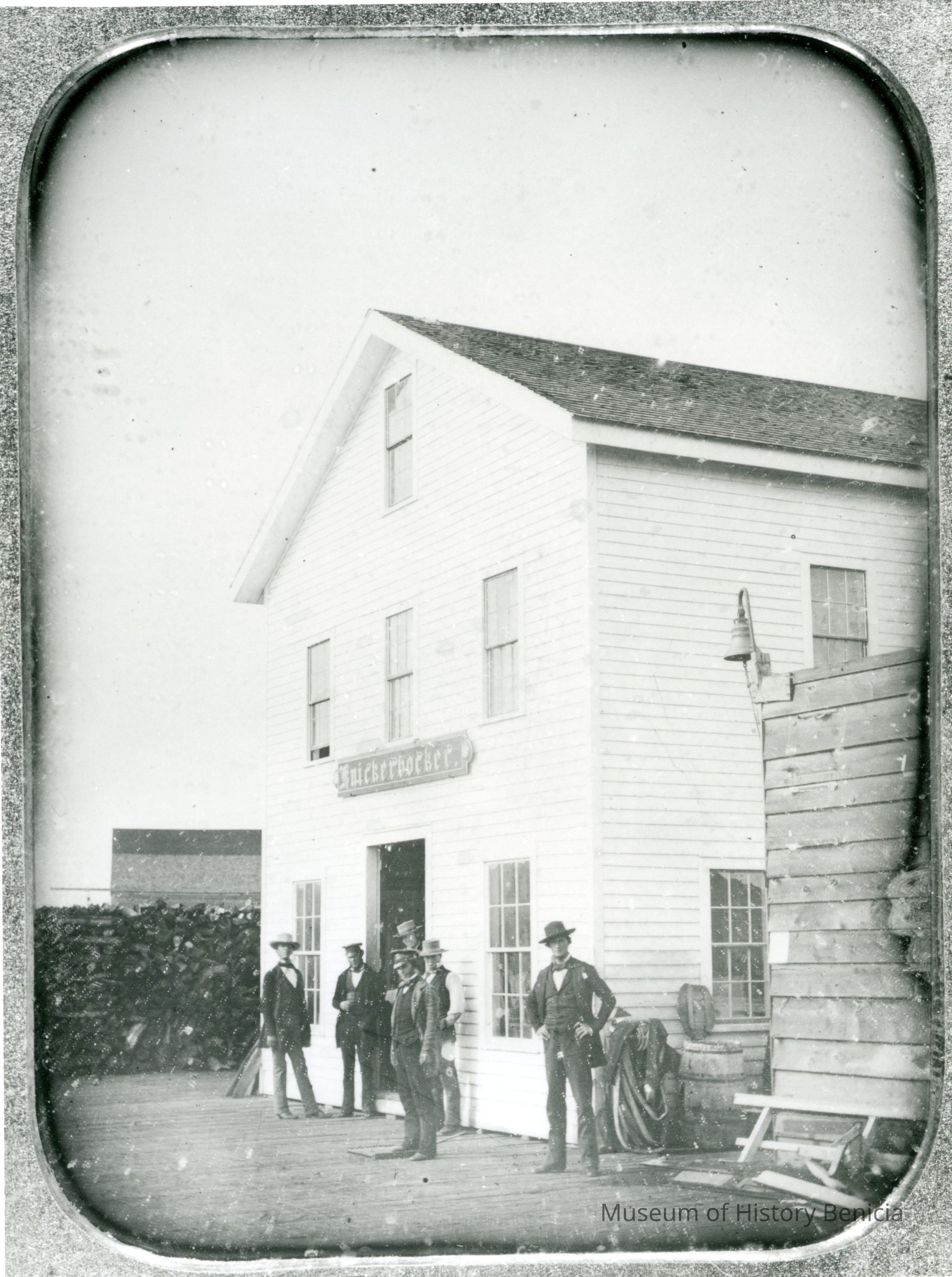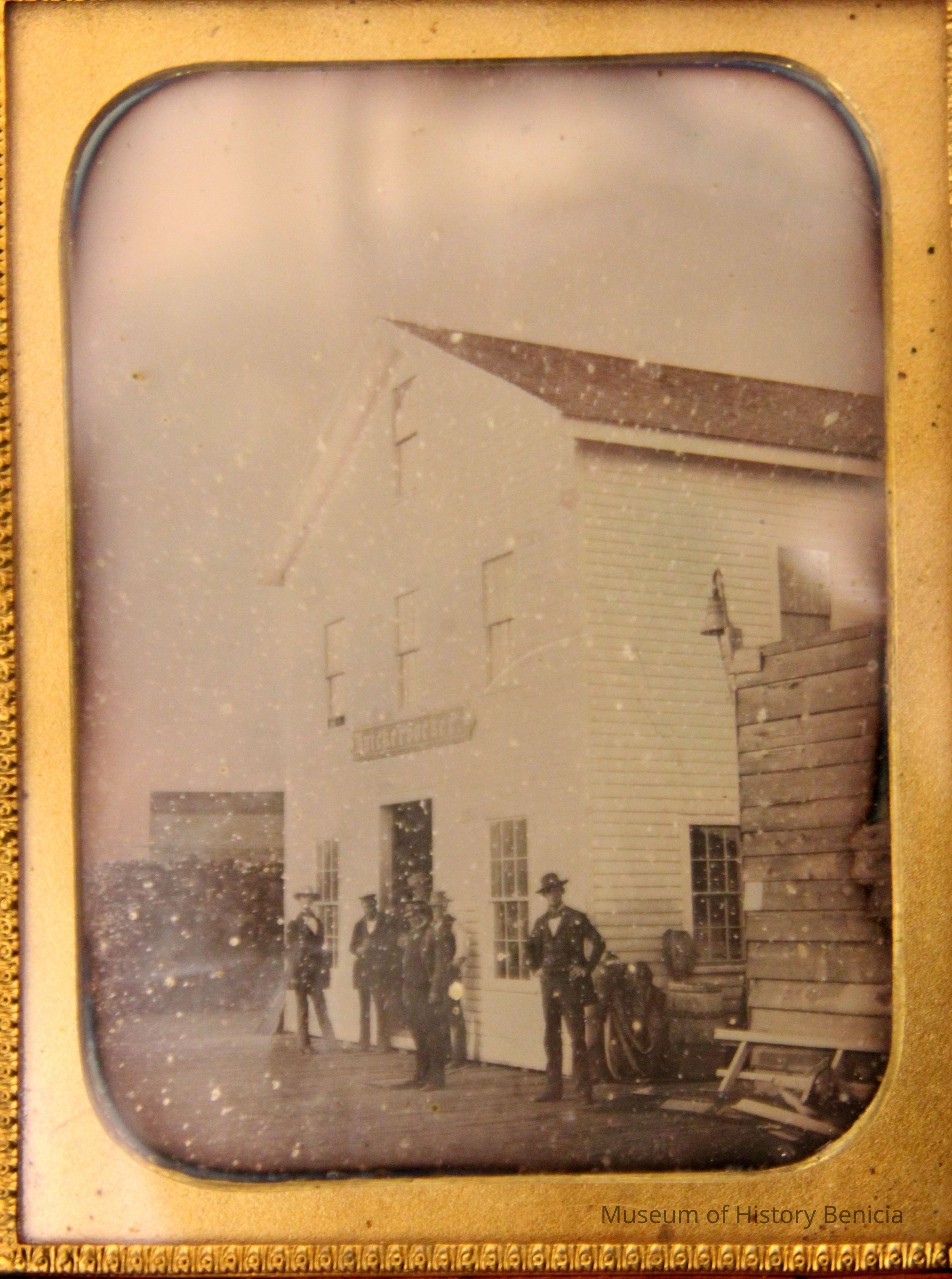 A copy of a photo from the California State Library Benicia collection. The original is a daguerreotype of men standing around a building on the docks of Benicia circa 1858. The photos were taken for the Gulick brothers who were early Benicia businessmen.