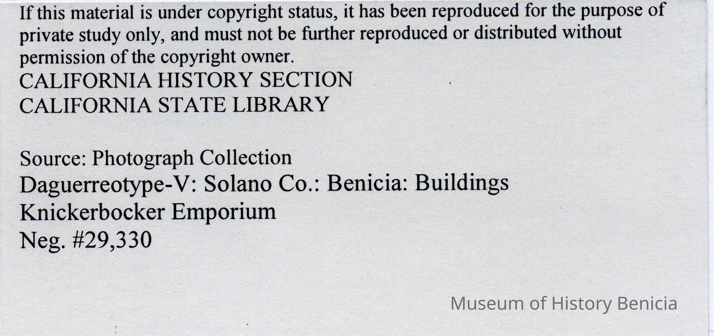 The building shown in the photo is called the Knickerbocker. The black and white copy is from the California State Library. The color version was taken at the library from the original and is only in digital format.Collection