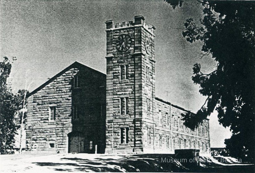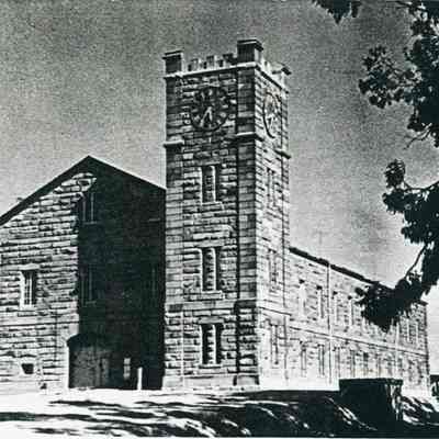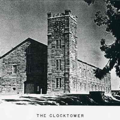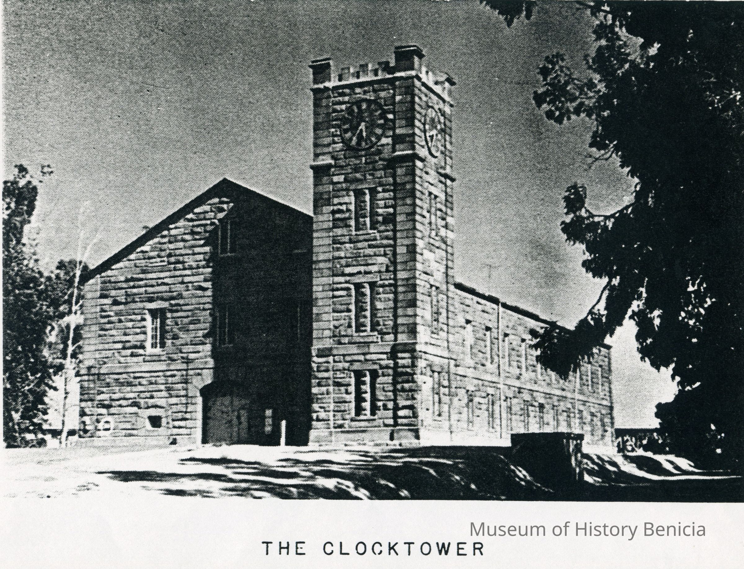 Black and white photocopy of an original photograph located at the Benicia Arsenal: "Storehouse constructed in 1859 of native sandstone blocks. In 1912 an explosion ripped off the roof and destroyed part of the third-story walls. It was restored as a two-story structure." (the Clock Tower).