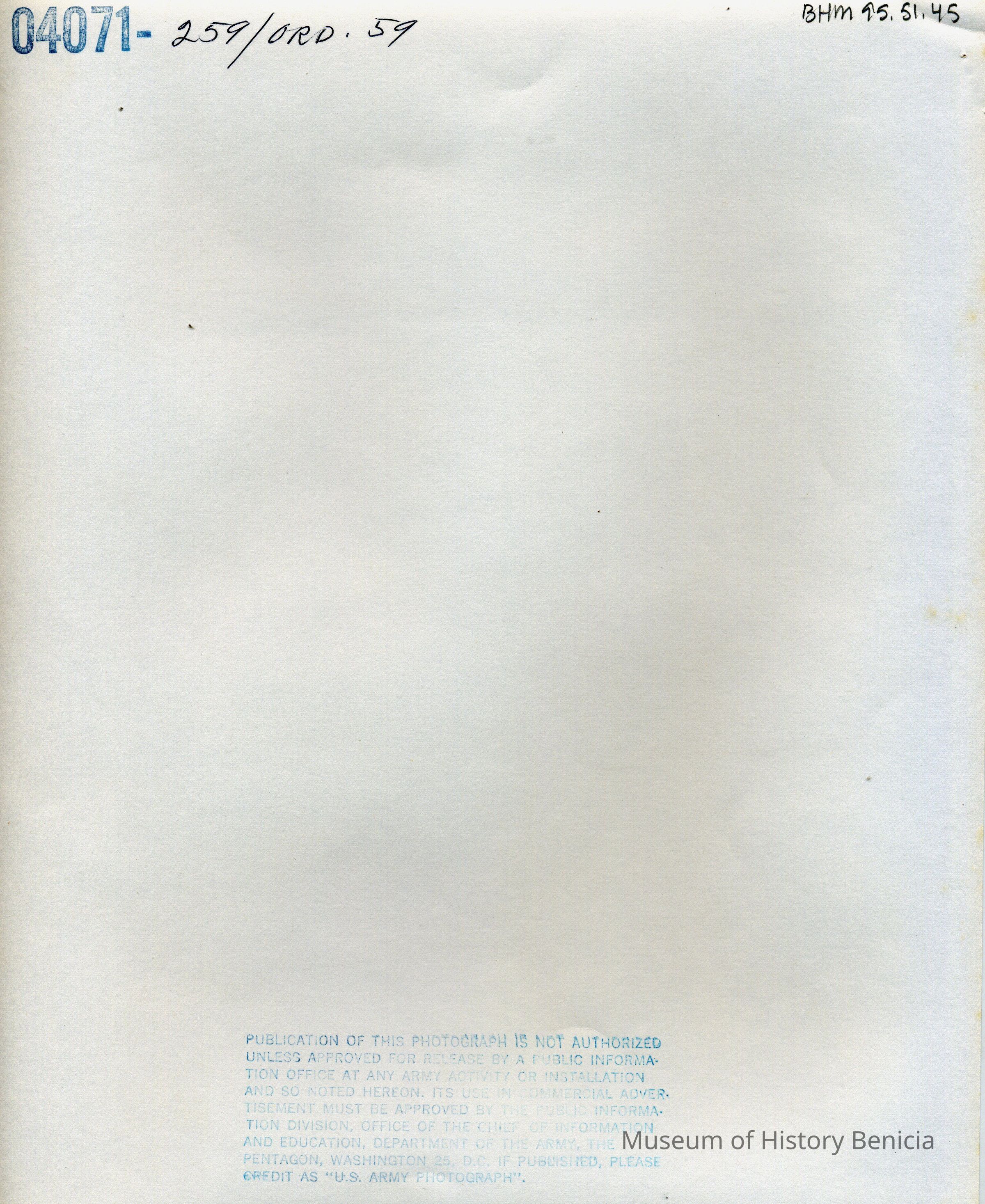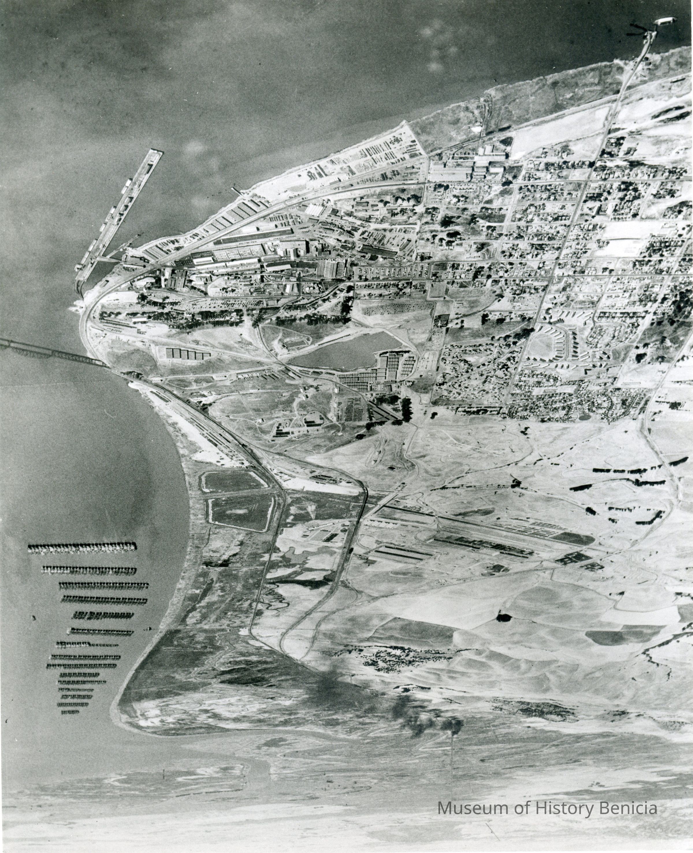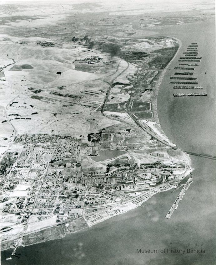 Benicia Arsenal looking north. Shows clock tower, railroad bridge and Mothball Fleet. Black and white photo.Collection