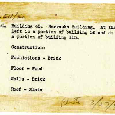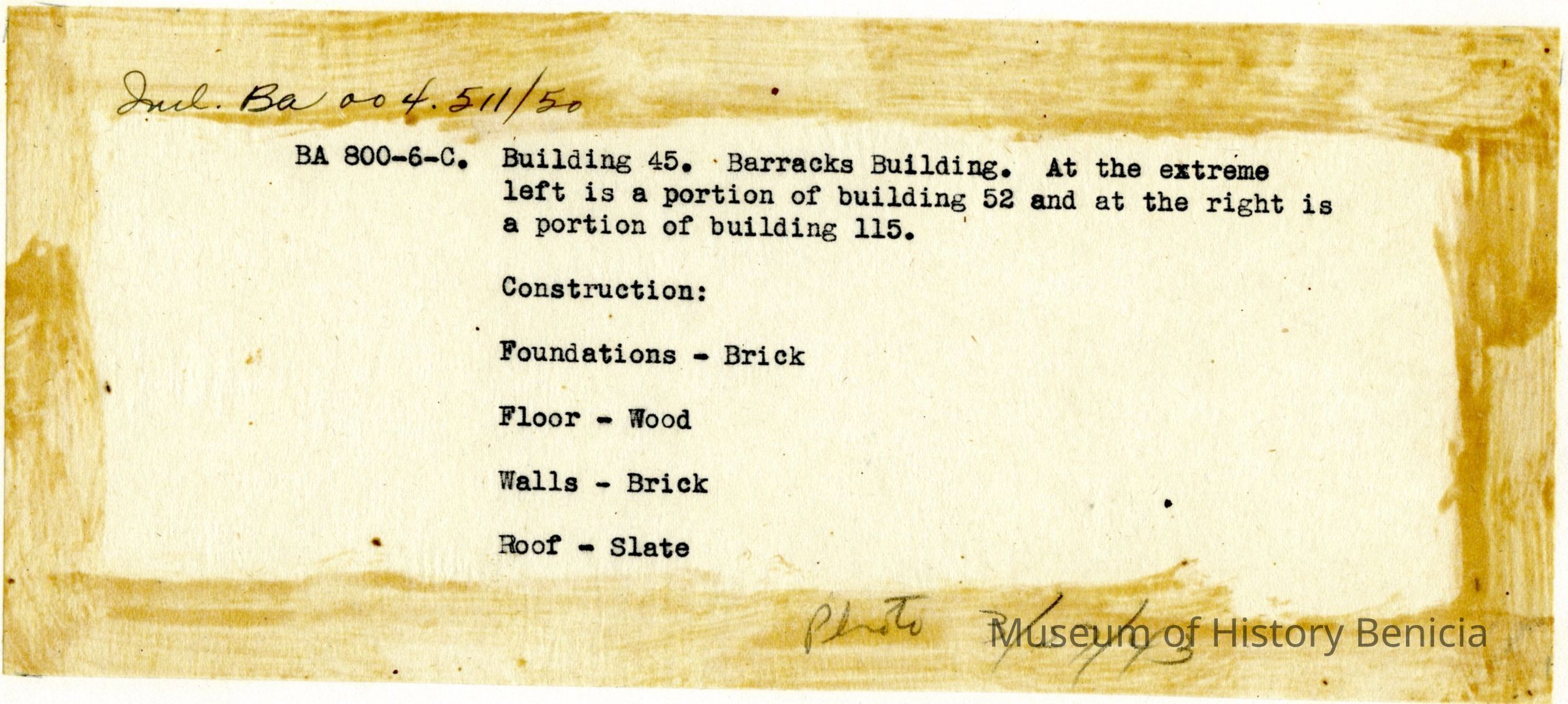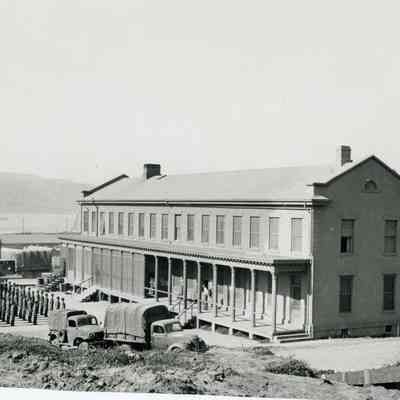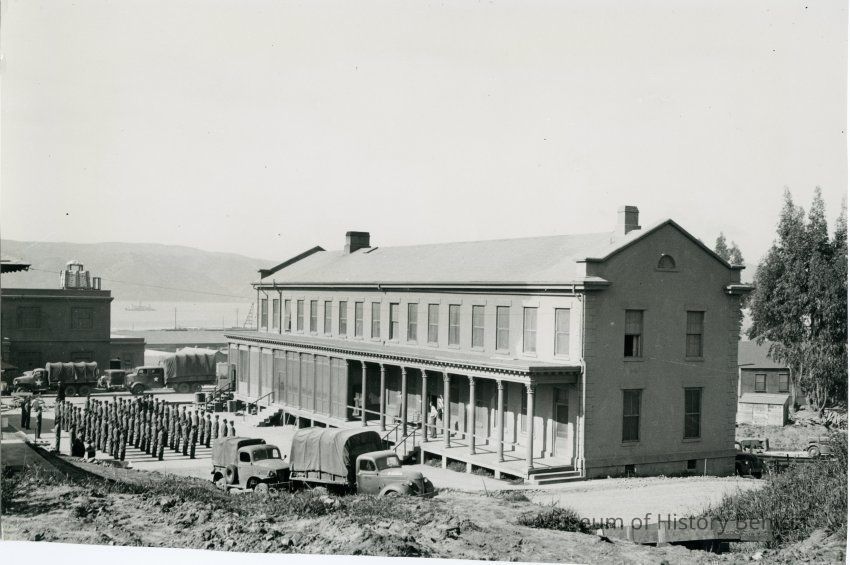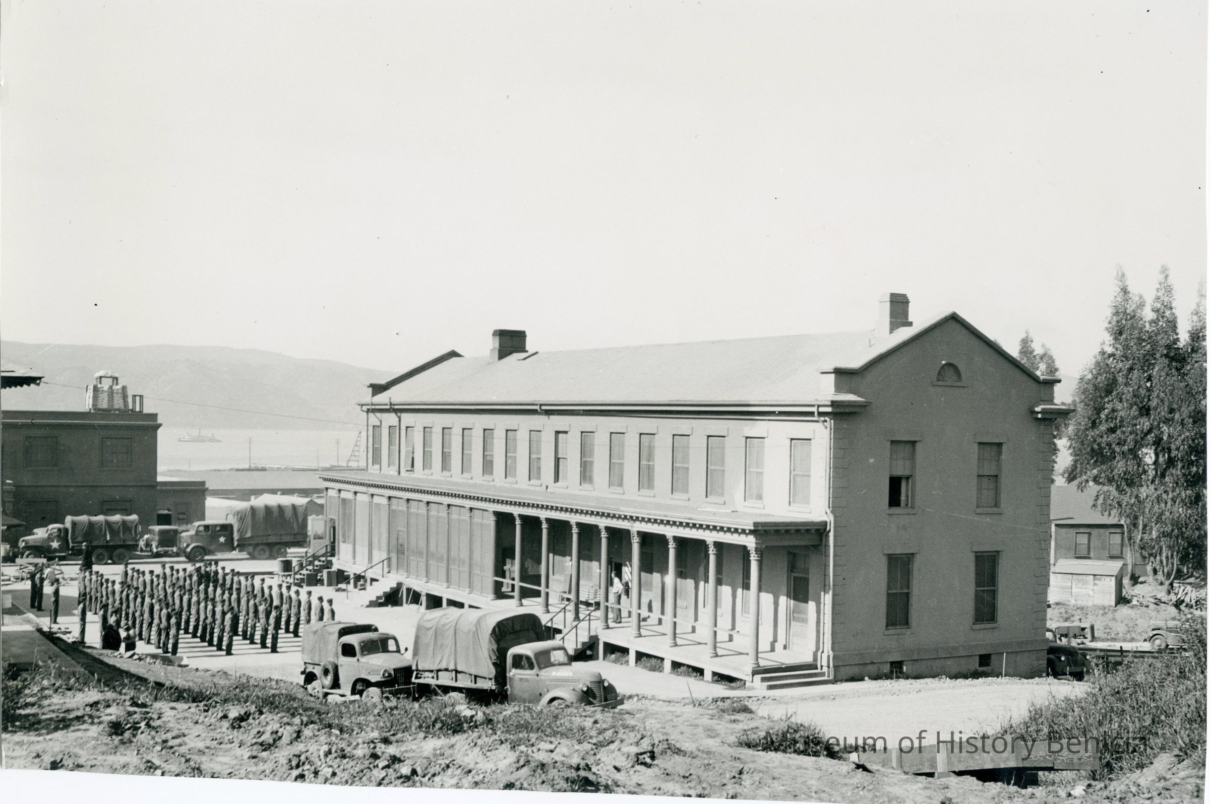 This is a photograph of the Barracks enlisted men (building 45). It was built in 1872. There are a number of men at attention in front of the building and Army trucks waiting outside. A ship (maybe a ferry boat) can be seen in the distance.