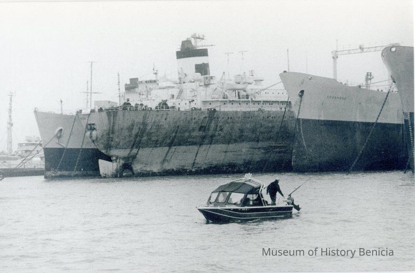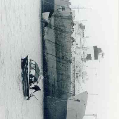 Framed photograph ships next to a dock with some guys in a small motor launch in the foreground. This photo and the next were in the Museum Director's office. Not sure how the museum acquired them (either as a gift or purchase) but they are now being added to the collection.