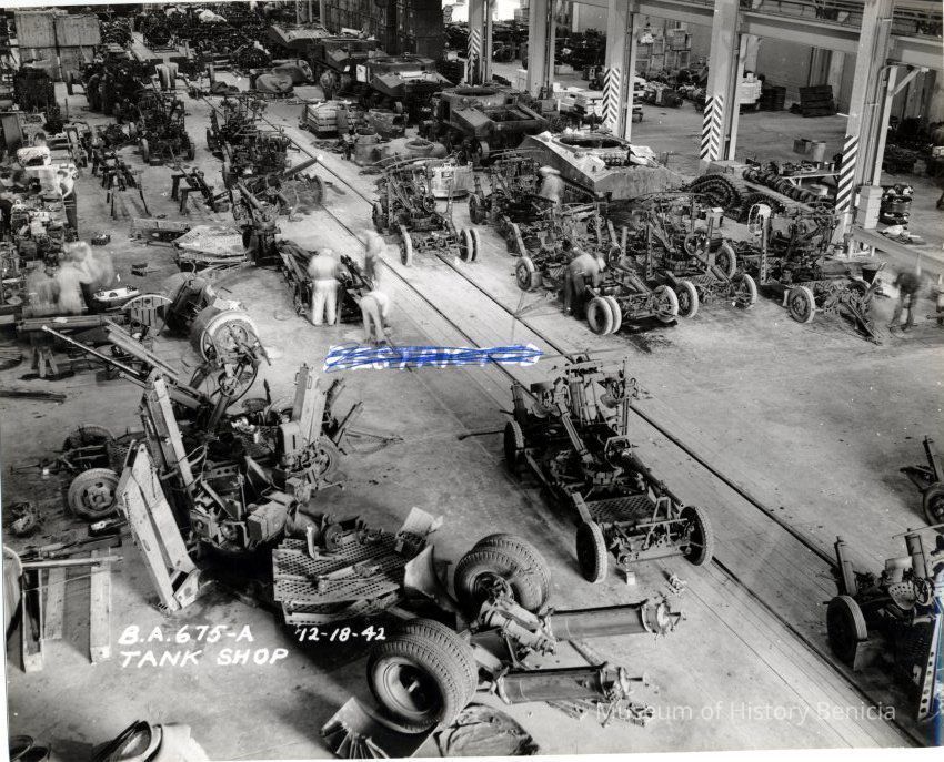 Photo from the Josephine Cowell research material. Shows the tank shop. Anti-aircraft machine guns in the foreground and Sherman tank bodies in the background. I the left foreground some AA guns are being broken apart for scrap or cannibalization.Collection