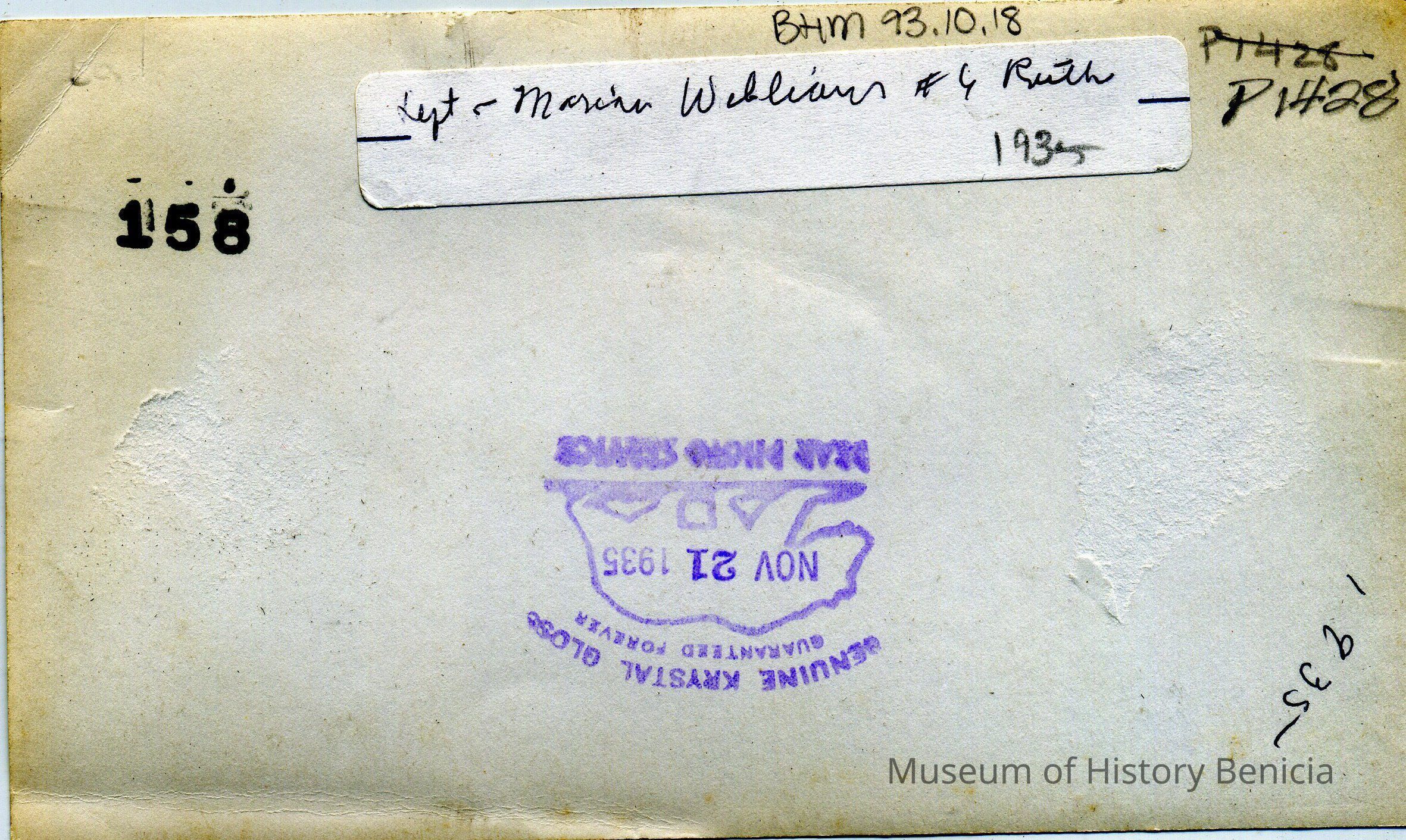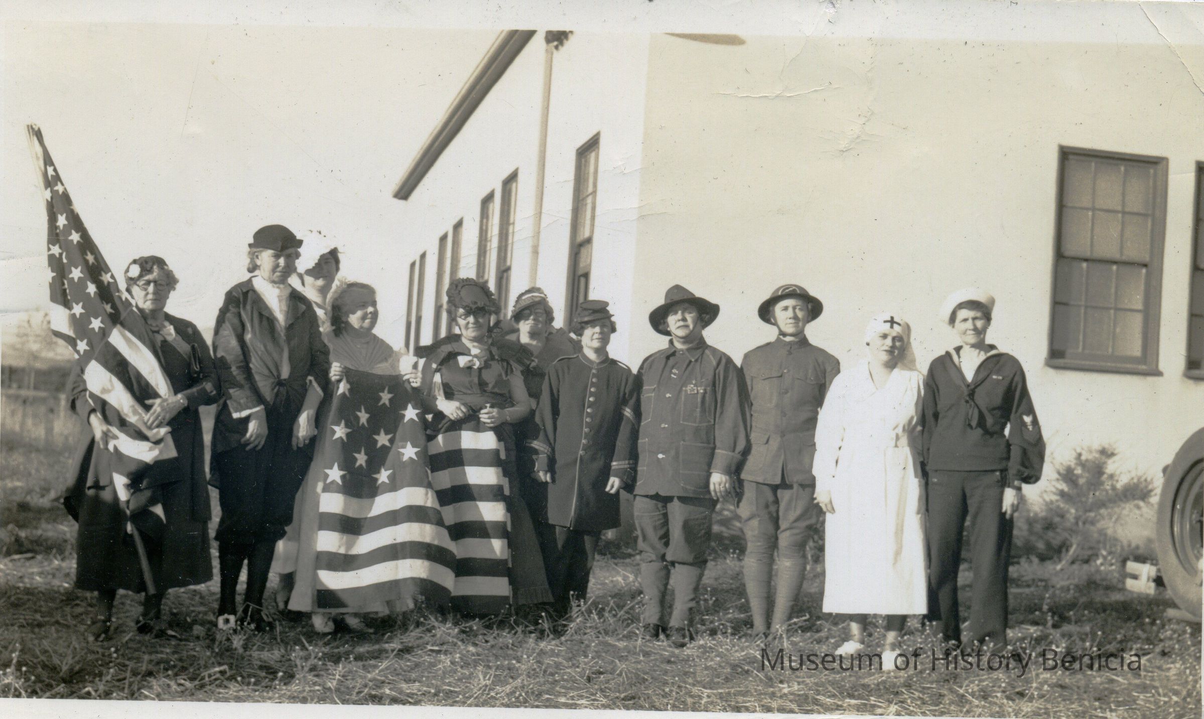 Eleven Benicians dressed in military uniforms for a pageant in 1935. Left - Marian Williams; 6th from left - Ruth Alexander. B/W photo.Collection