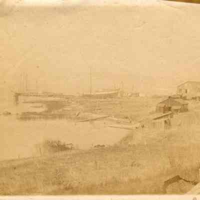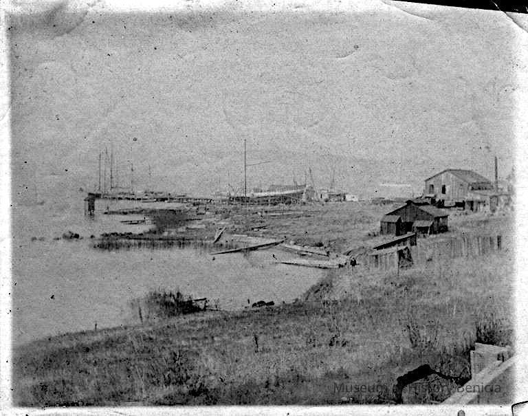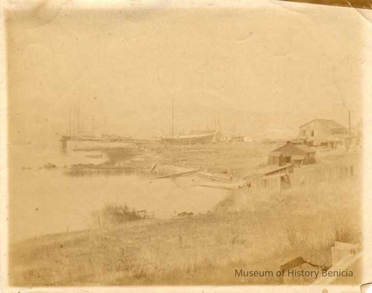 Sepia toned photograph of ships in the Benicia shipyard.