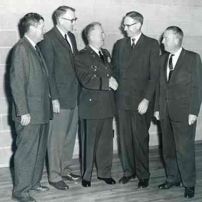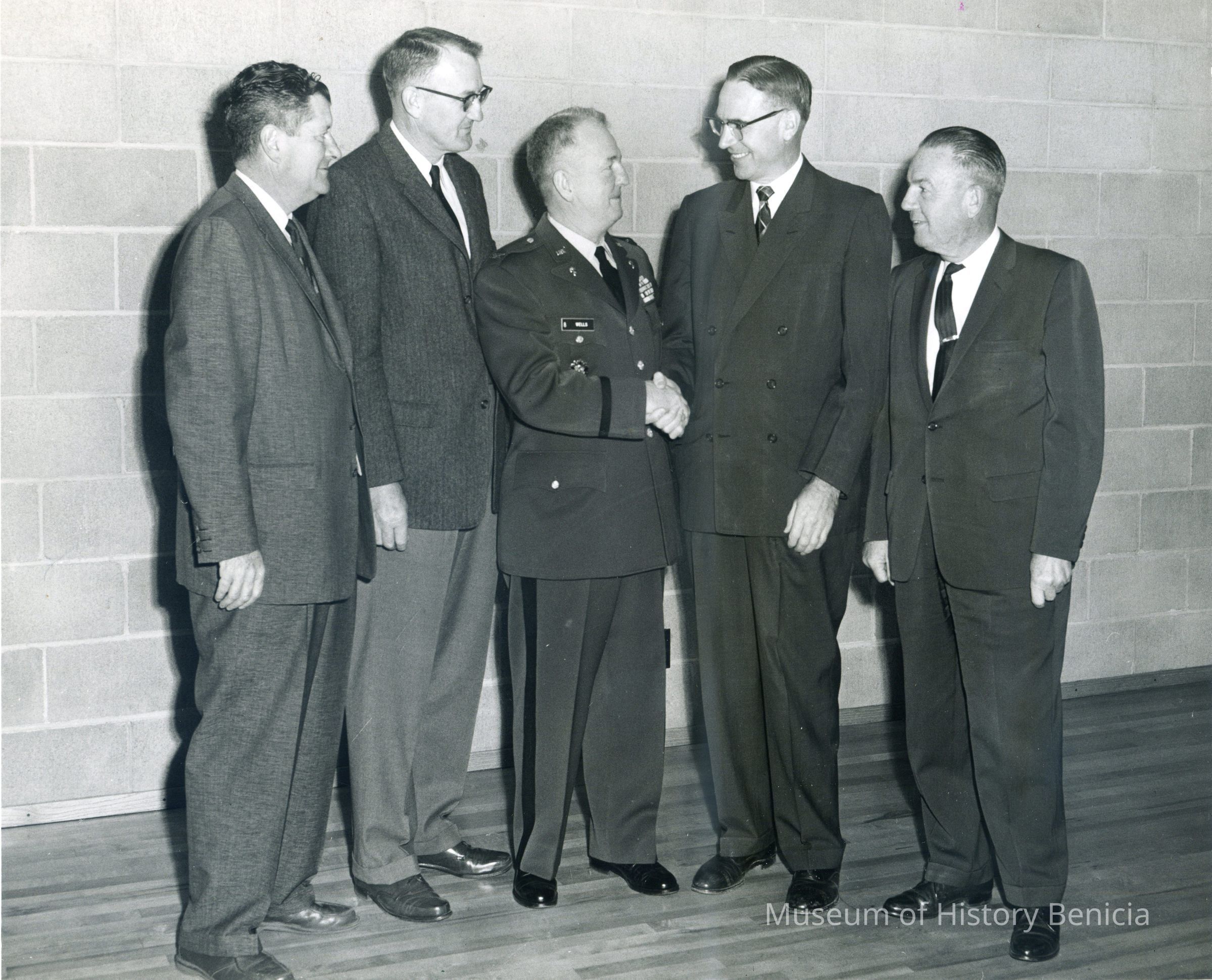 This is a photo of men at a ceremony. Col. Wells is in the middle being congratulated. The names on the back are: