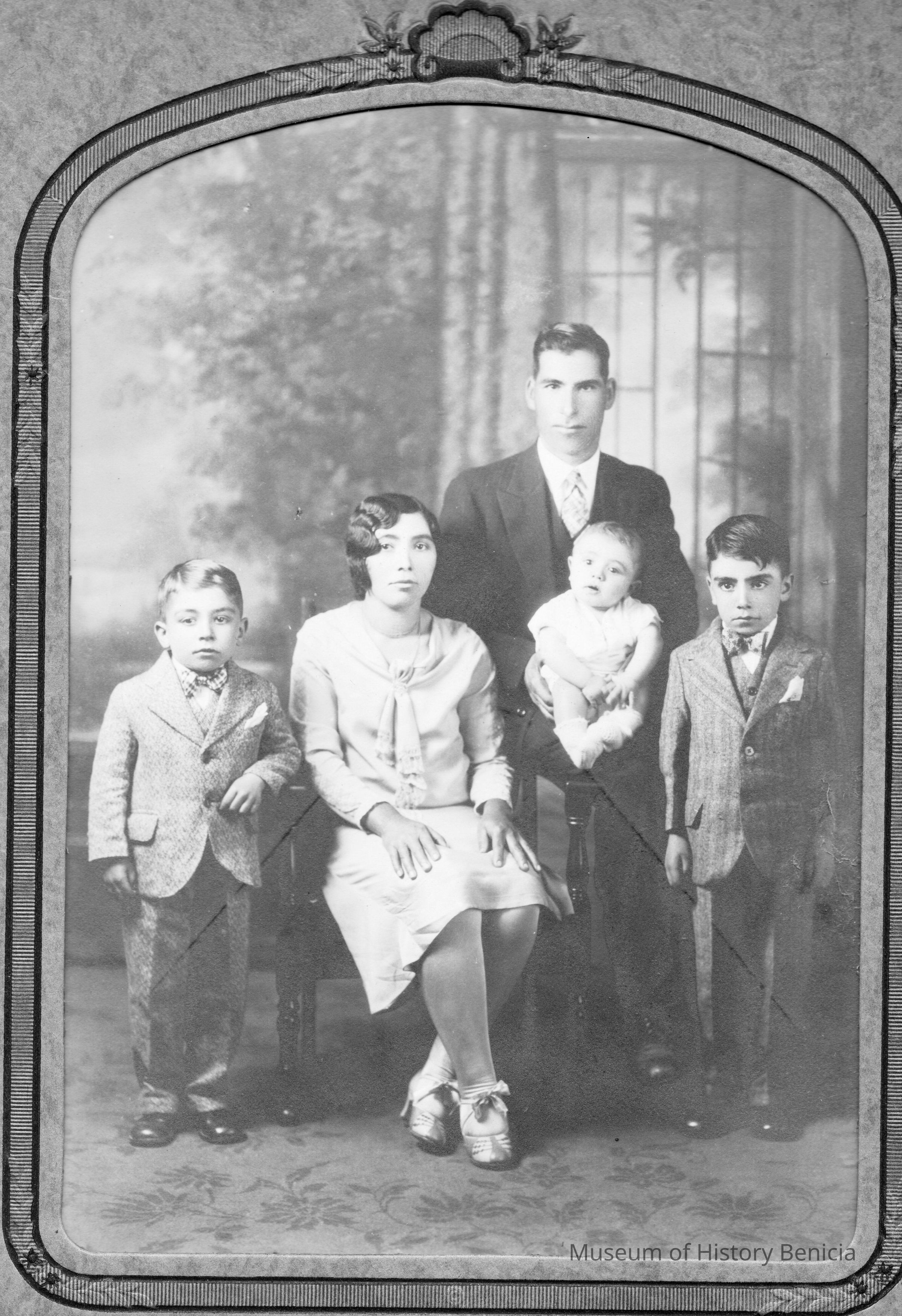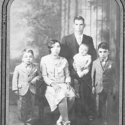 Studio photo of a family man, woman, two small boys and a baby. On the back is writting probably in Portugese.