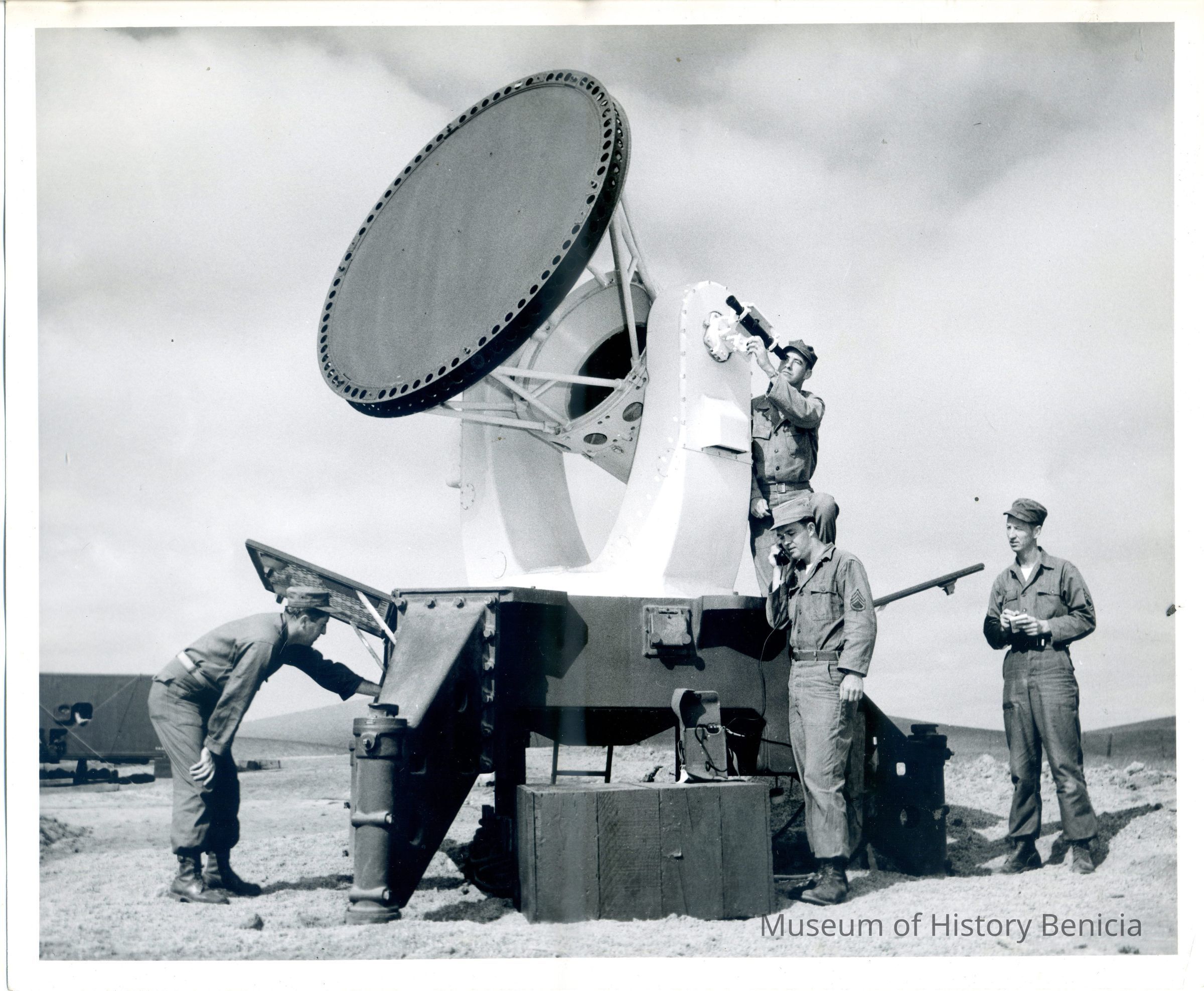 Photo from the Josephine Cowell research material from 1954. Shows a group of soldiers in a field with a radar.
