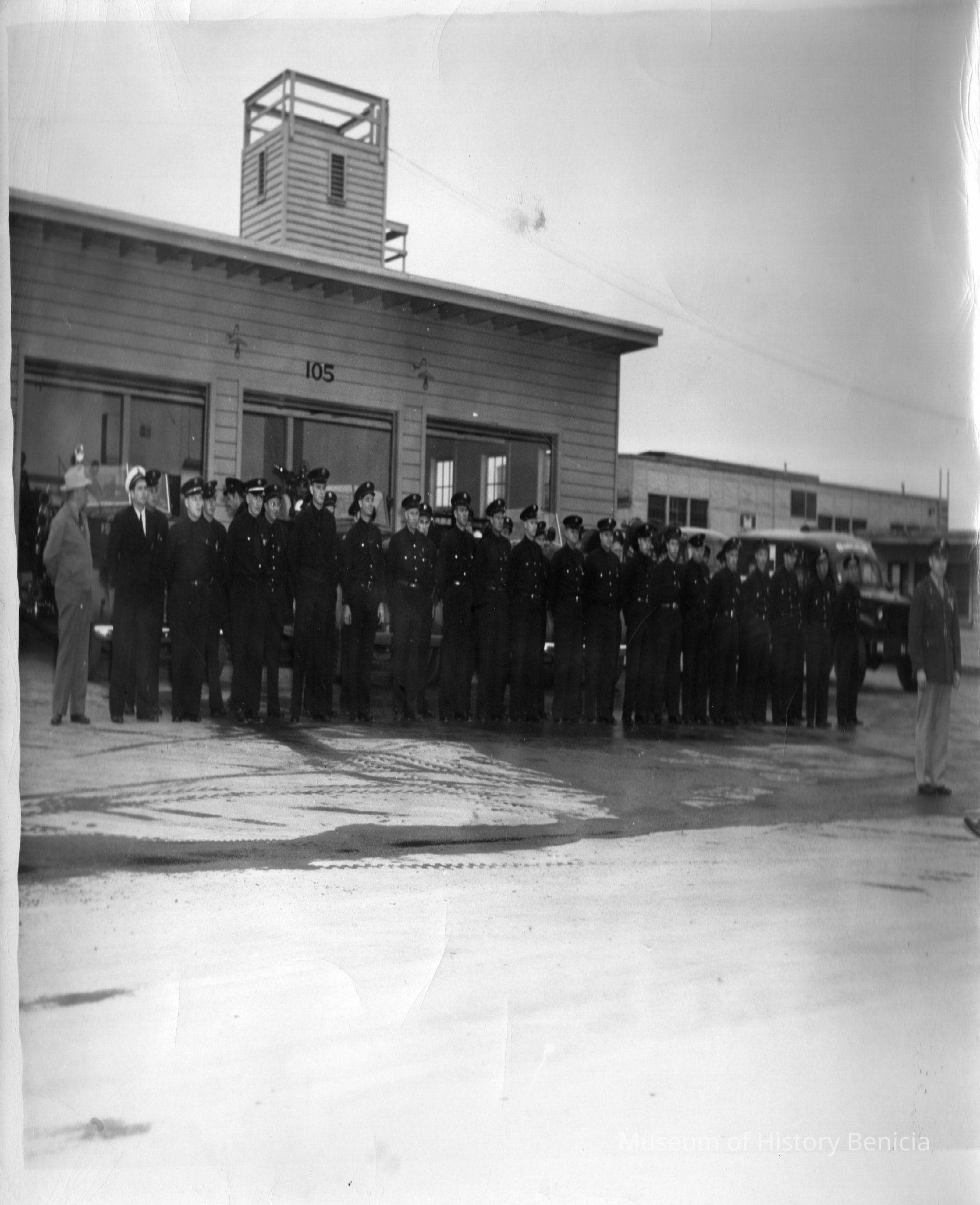 B/W photograph: 2 lines of men in dark uniforms in front of wooden building with tower, marked "105". They appear to be firemen in the arsenal. There is a man in an Army uniform at the far right.Collection