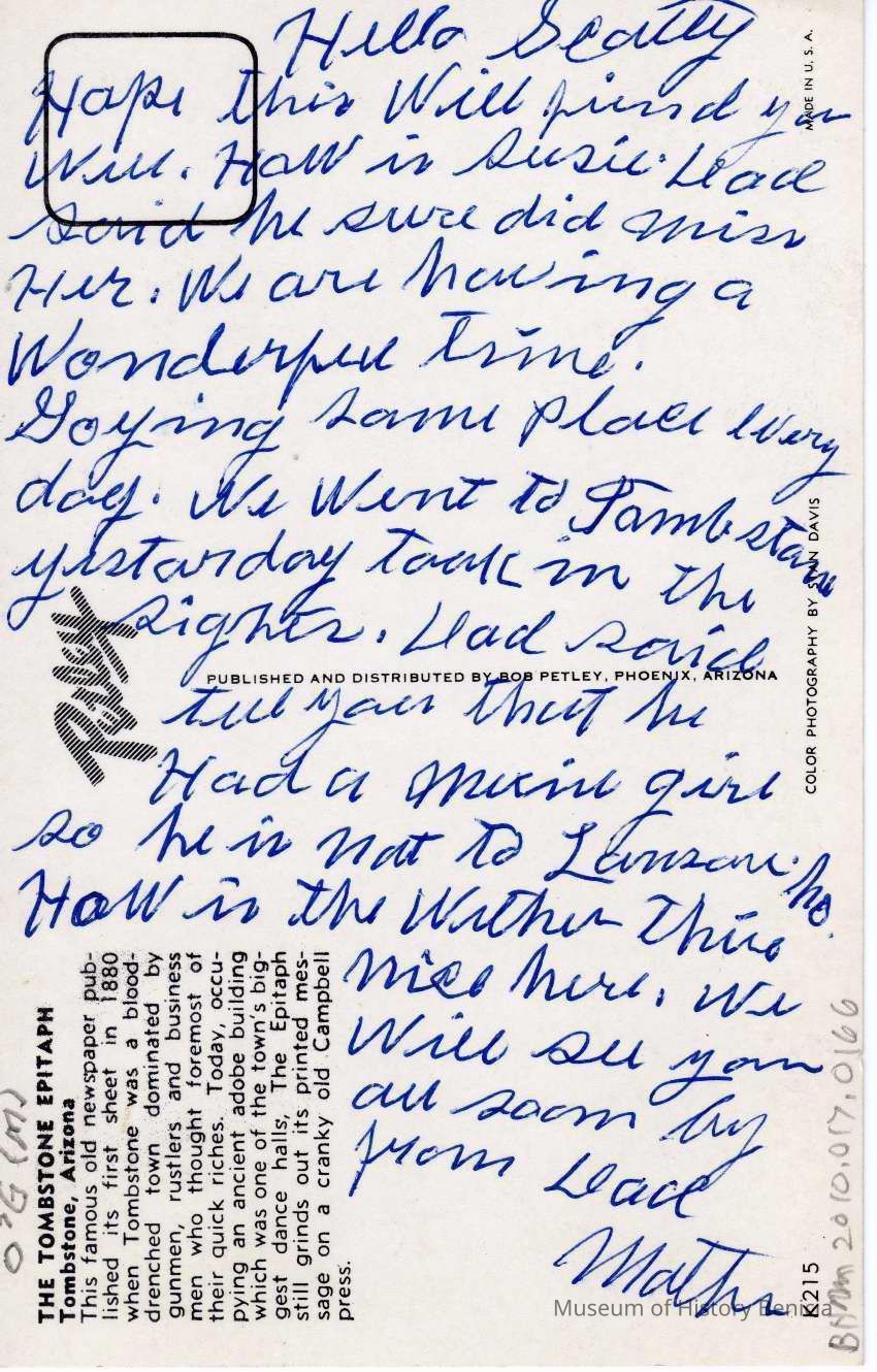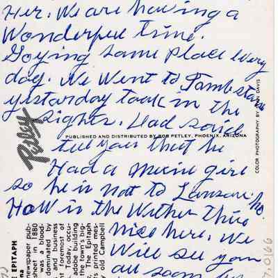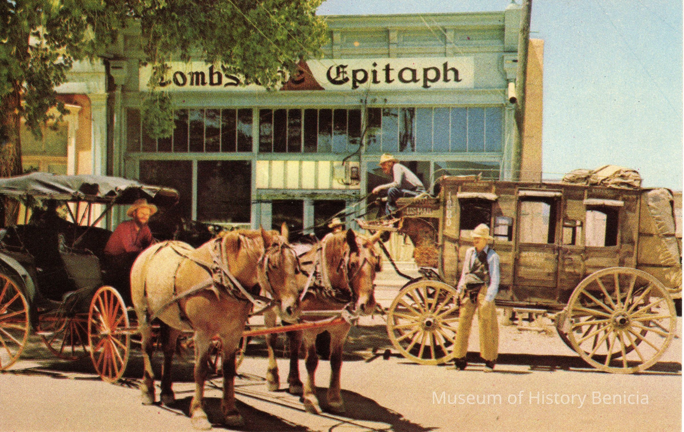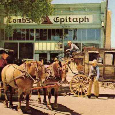 Postcard of Tombstoe AZ. In color. Shows stage and guys dressed as cowboys.