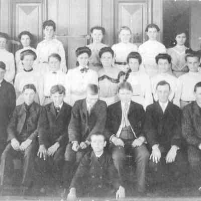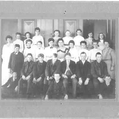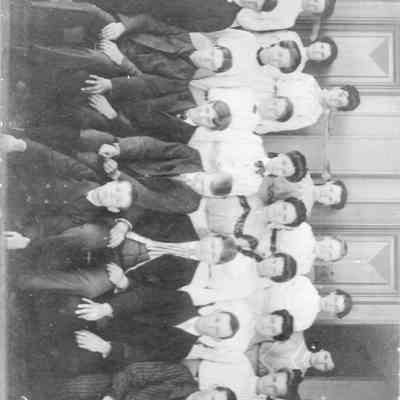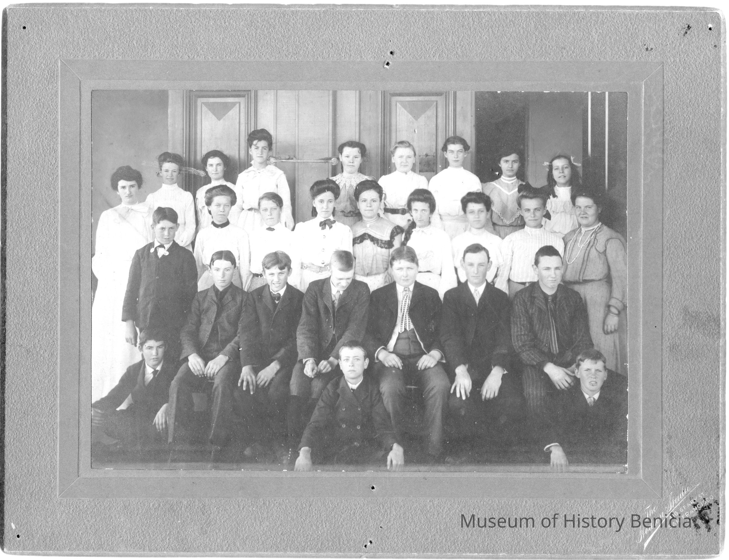 Photo of group of young men and women next to outside doors of a building. The back says J A McClain. The studio is the Hodson Studio in SF CACollection
