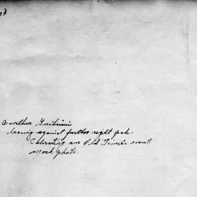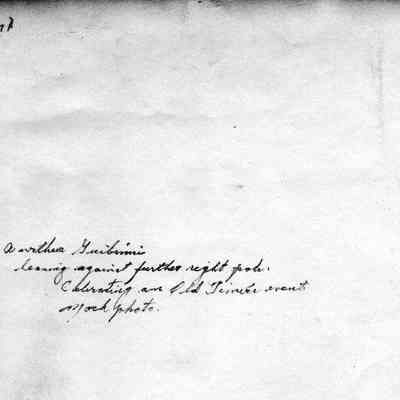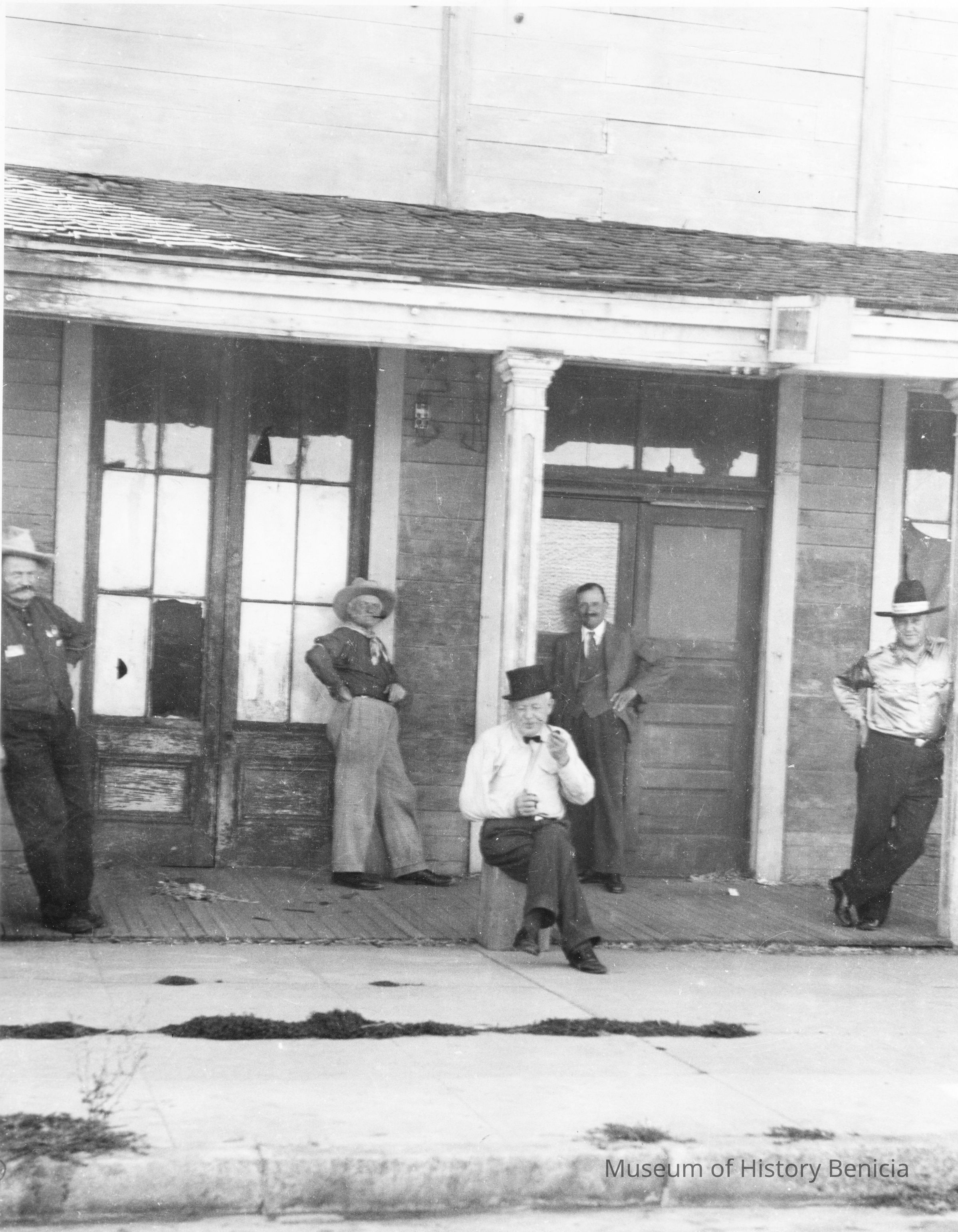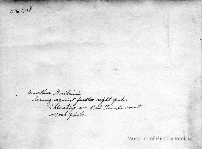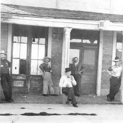 Photo of guys on sidewalk dressed up for the Old Timers Days. The back identifies them as Arthur Guibinni, leaning against the right pole,.Collection